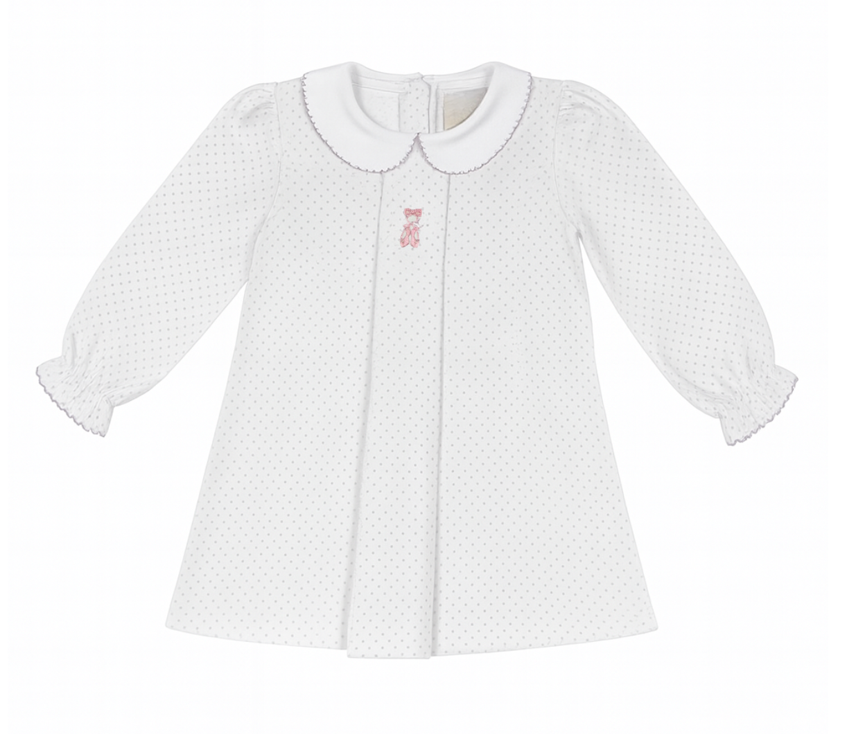 This soft knit dress is a great option for her wardrobe that works well for play time and for dressier occasions, too. Featuring long sleeves, a white knit and lavender polka dot fabric with an A-line shape, a white Peter Pan collar and hand embroidered ballet slippers. A center pleat, puffed shoulders and elastic gathered wrists elevate the look.