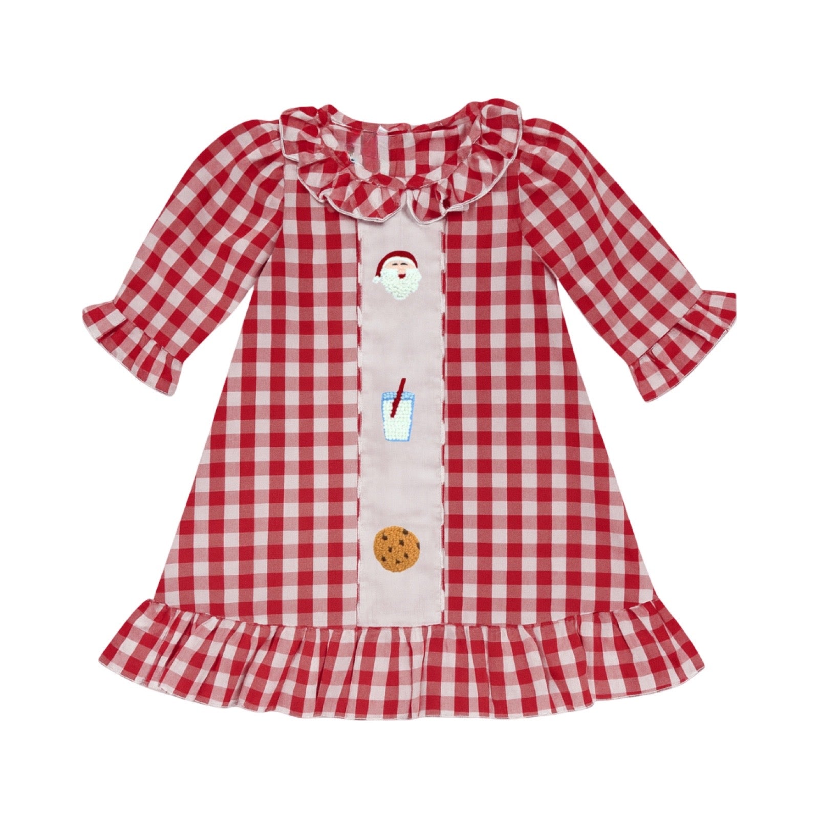 Dress your little one in festive fun with this cozy red check nightgown, adorned with delightful embroidered milk and cookies. Soft and snug, it’s perfect for holiday evenings filled with warmth and cheer, making bedtime a joyful celebration of Christmas magic.