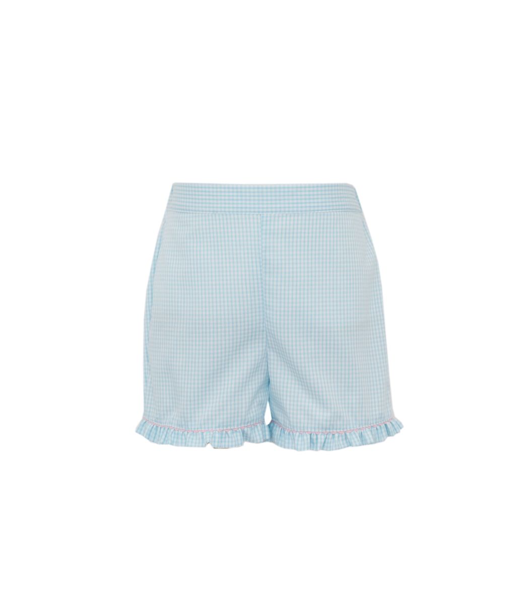 Girl's Aqua Blue Gingham Ruffle Shorts w/ Pale Pink Ricrac