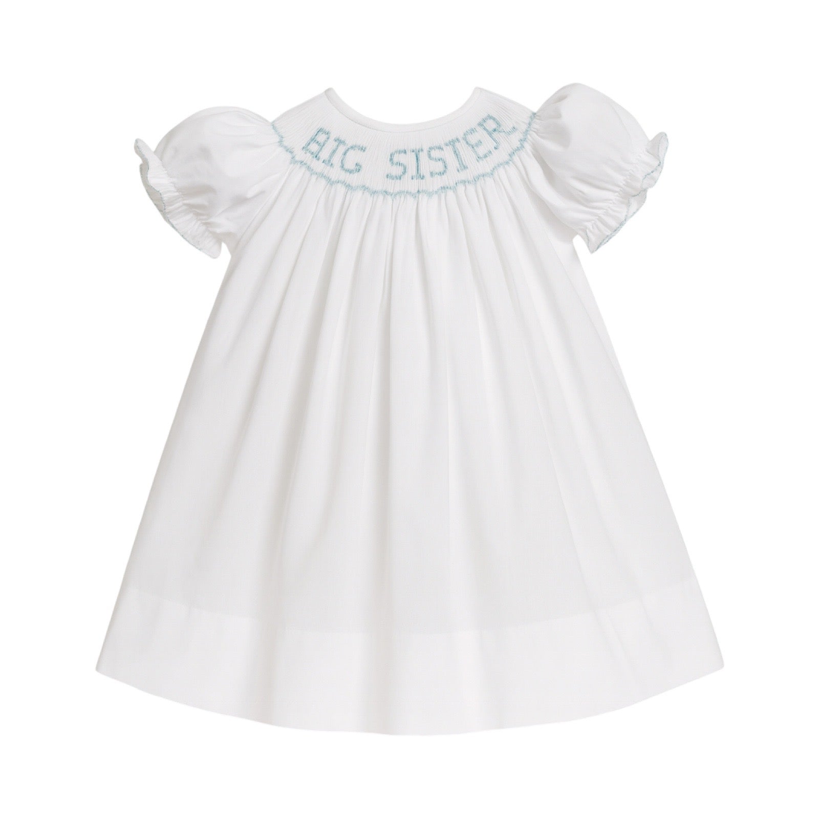 Short sleeve bishop style white dress with light blue "BIG SISTER" smocked detailing.