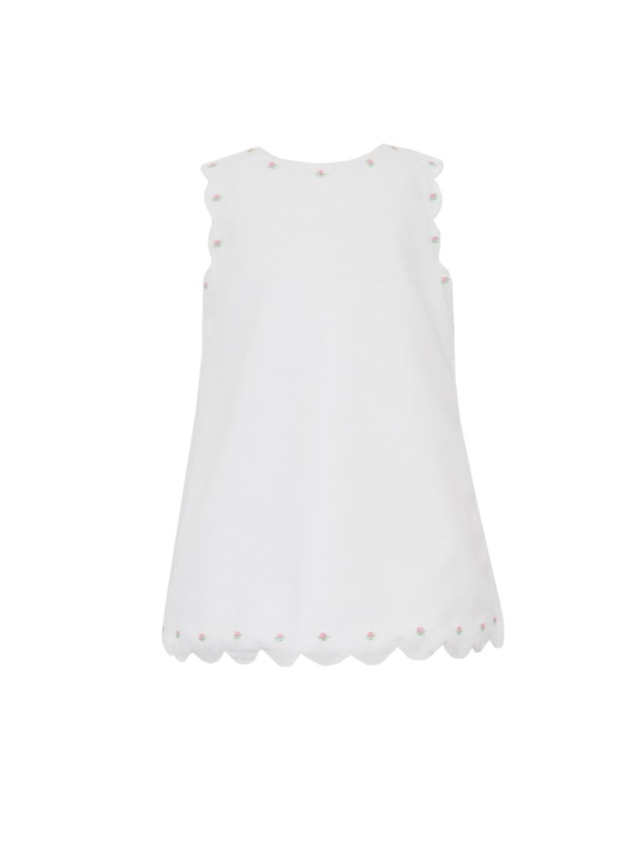 A beautiful sleeveless A-line dress in white pique fabric with scalloped edges and delicate pink embroidered flowers along the neckline, the scallop, and the bottom hem. Gorgeous, simple, and perfect for special occasions and Easter.