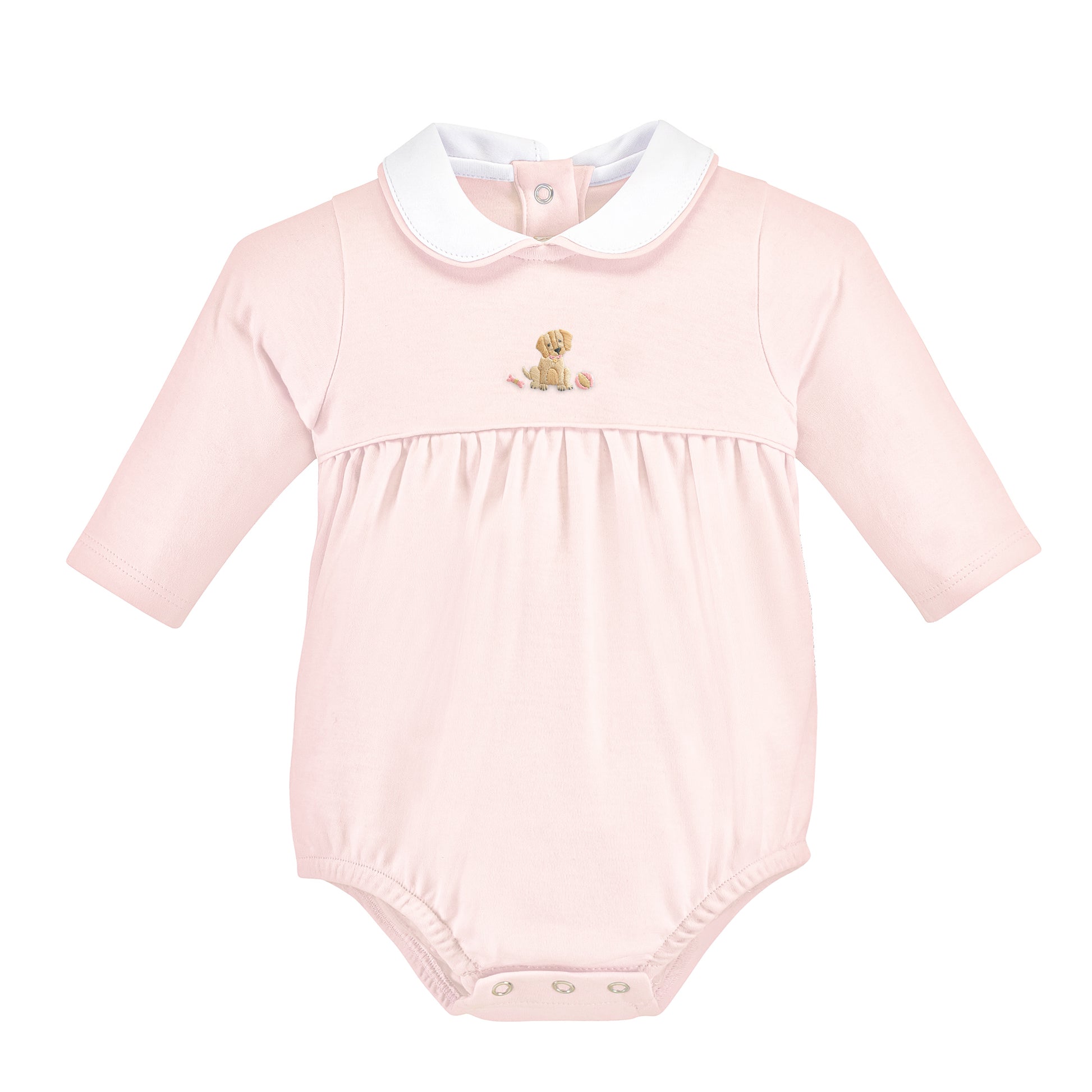 This charming long sleeve pink bubble romper features an adorable embroidered girl puppy, adding a sweet touch to your little one's outfit. The classic Peter Pan collar enhances its playful and timeless style, making it perfect for both everyday fun and special occasions. Crafted for comfort and cuteness, this piece keeps your baby cozy while looking utterly delightful.