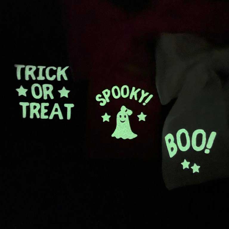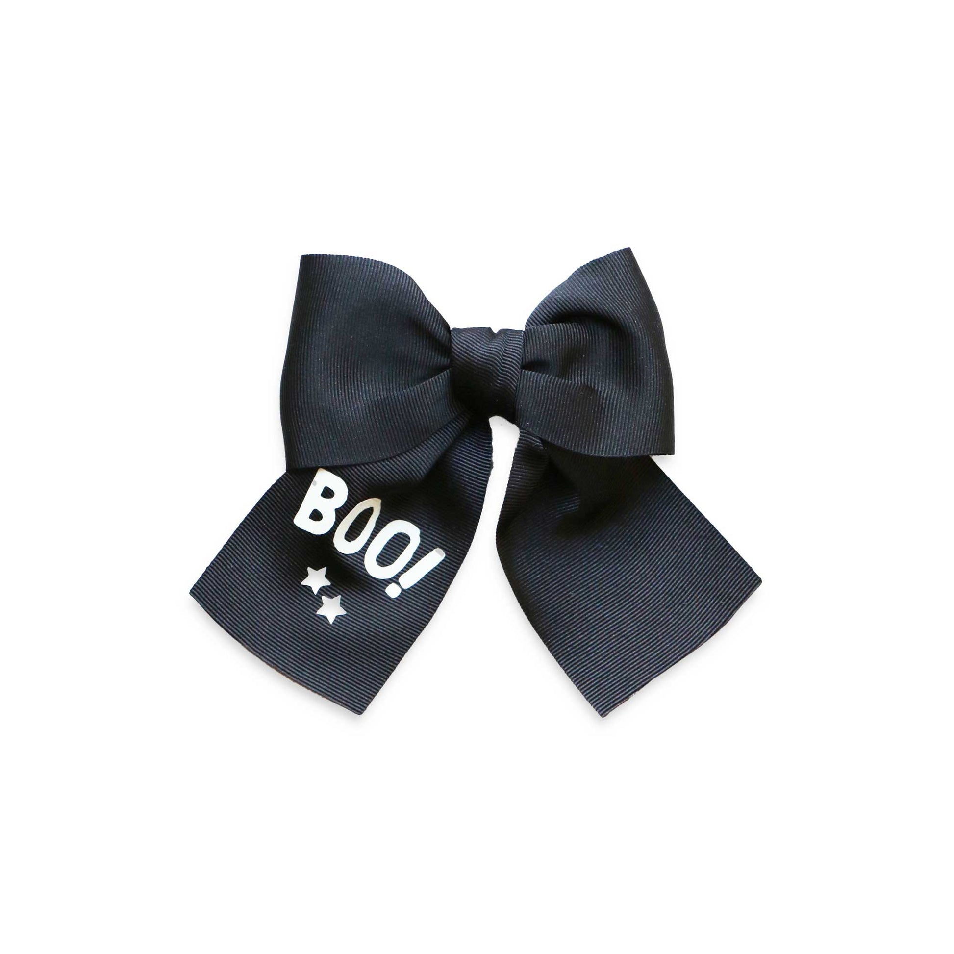 Add some fun to the Halloween season with this grosgrain hair bow with glow in the dark letters that spell "BOO!". So fun she will want to wear it everyday.