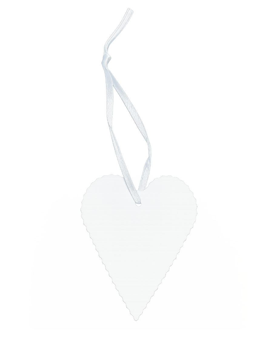 The little details: Card stock scalloped edge heart shaped card with a white satin ribbon.