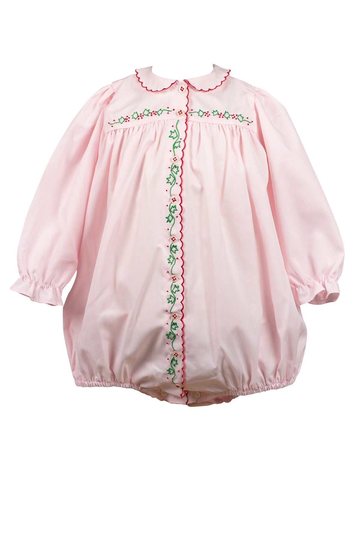 The Ivy Holly Bubble is a festive favorite in pretty pink, perfect for holiday cheer. This long sleeve woven bubble features a button-front design and charming holly embroidery that trails down the front and across the upper chest. Topped with a sweet scalloped collar, it’s as adorable as it is classic—making every holiday moment extra special. Coordinates with the Ivy Holly Dress for a sweet girl matching moment.