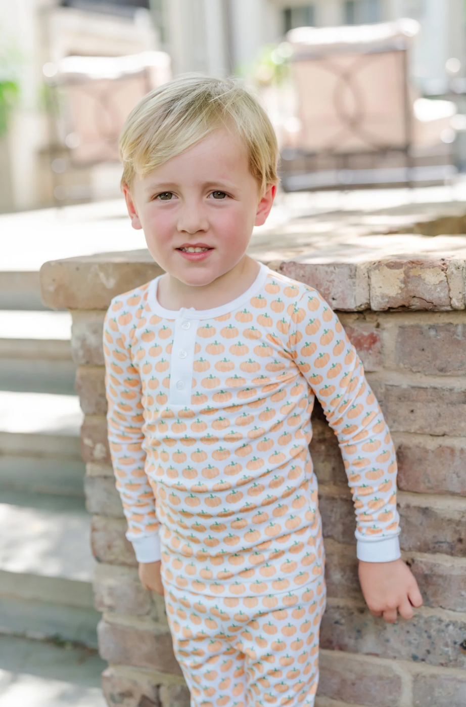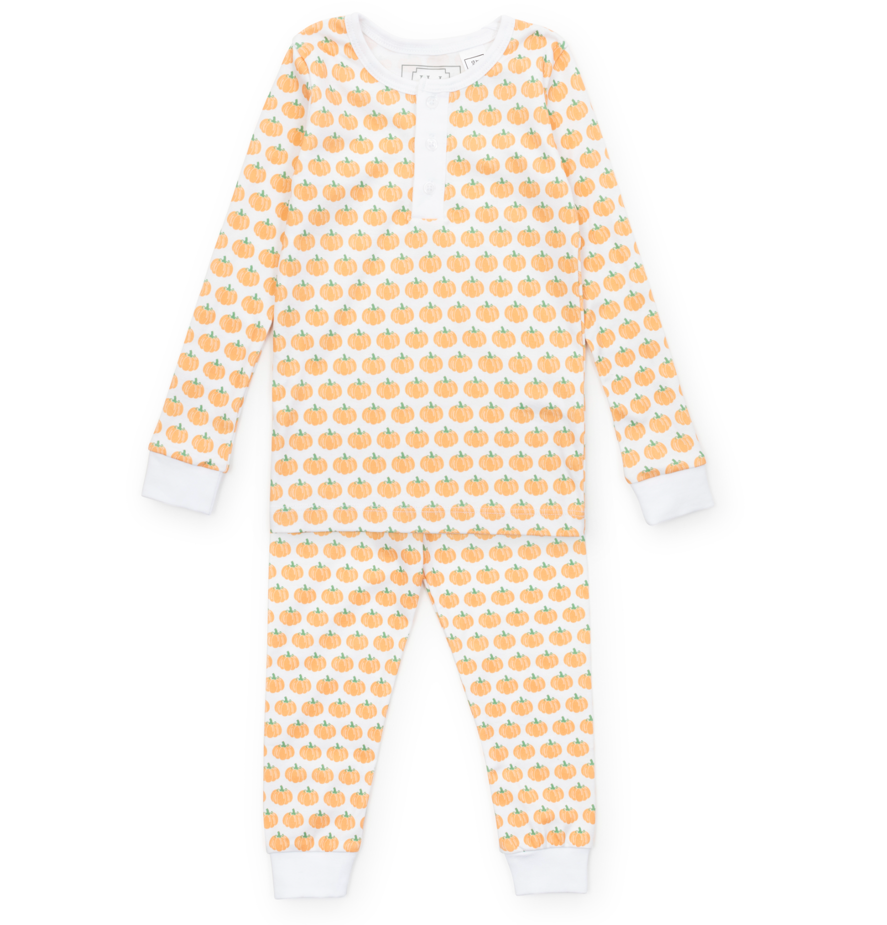 These playful pajamas feature charming Jack-o'-lanterns and candy corn prints, perfect for your little pumpkin! This two-piece set includes a long-sleeve Pima cotton top with white trim and a button placket, plus matching pants with white banded cuffs at the wrists and ankles. The white buttons, stitched with orange thread, add a delightful seasonal touch. With an elastic waistband for comfort, these PJs make bedtime a sweet treat all season long.