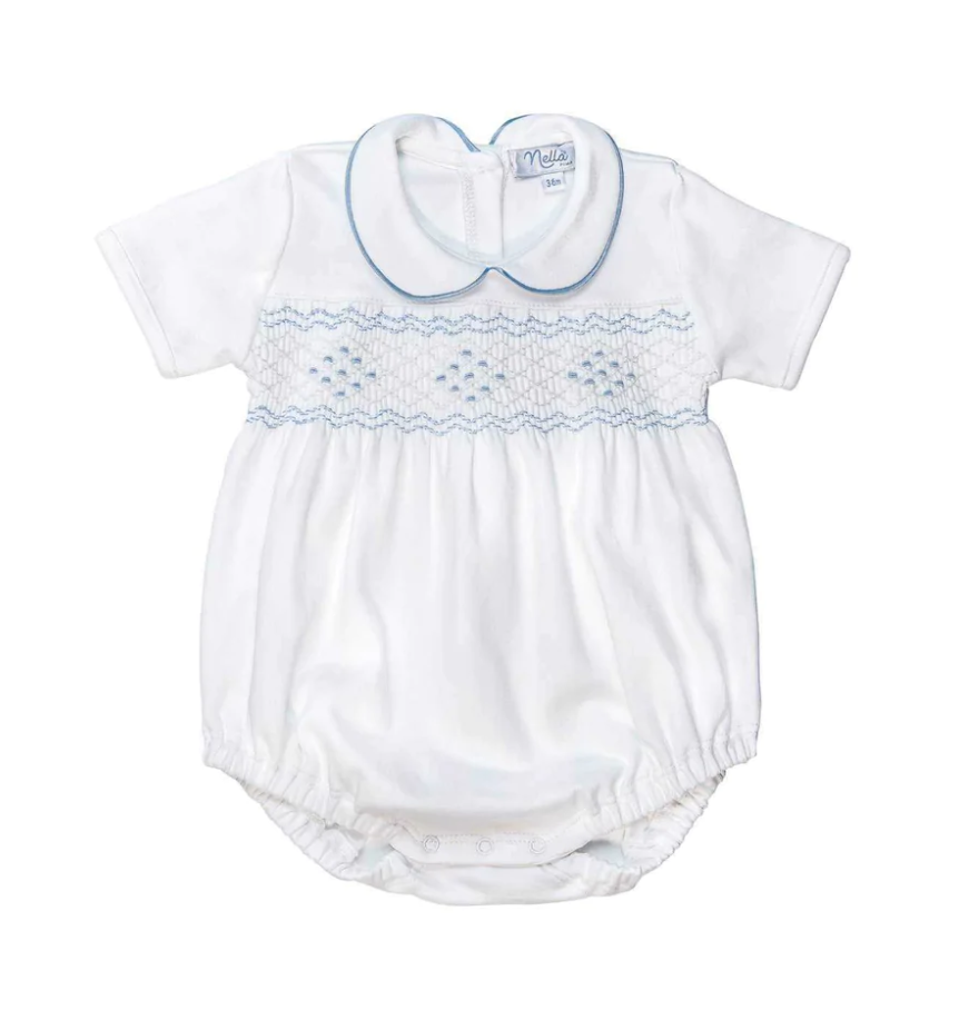 A beautiful pima bubble with smocked detailing and collar