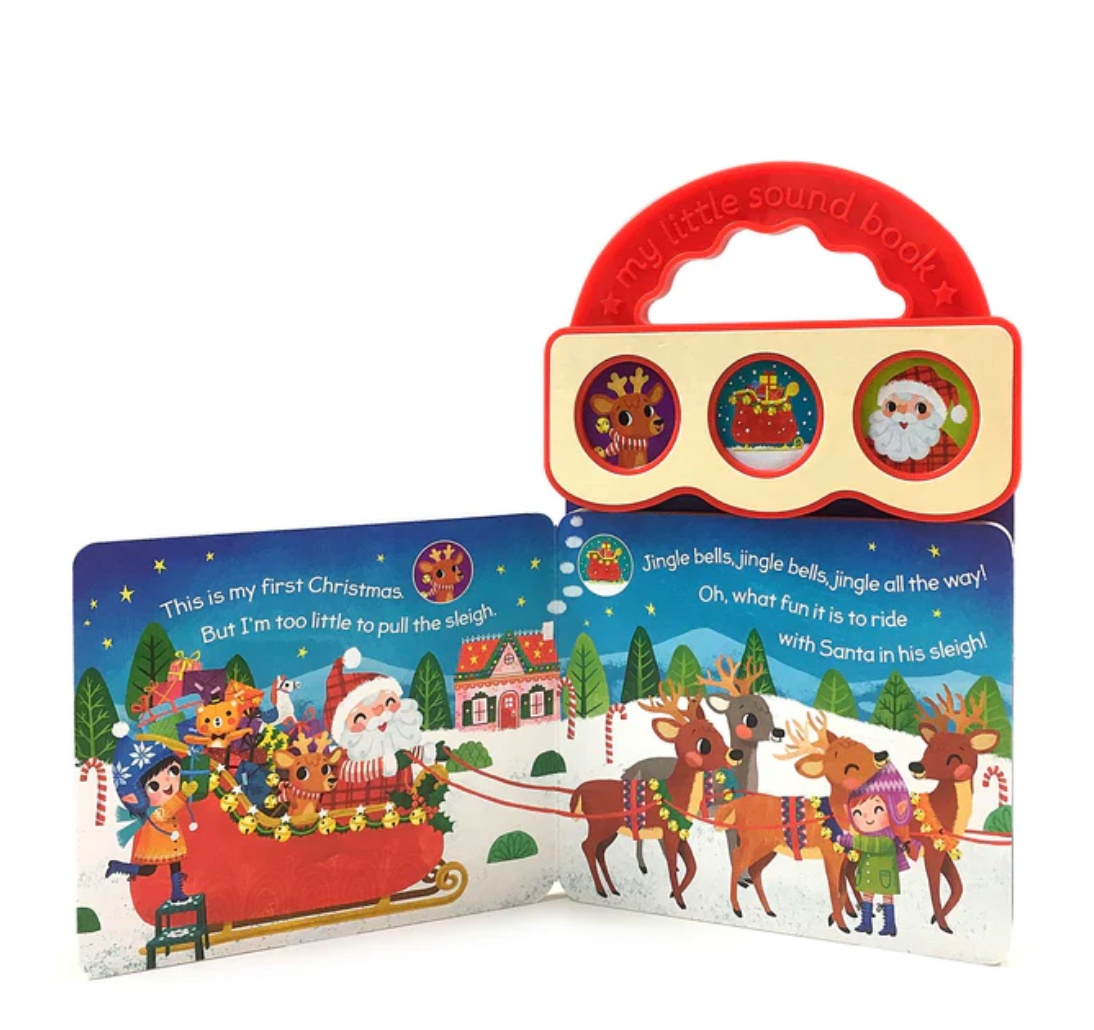 A new, little reindeer rides along with Santa in his sleigh! Three audio buttons play two sound effects, plus the "Jingle Bells" melody that goes with sing-along lyrics. The sturdy handle is just right for little hands, at home or on the go.