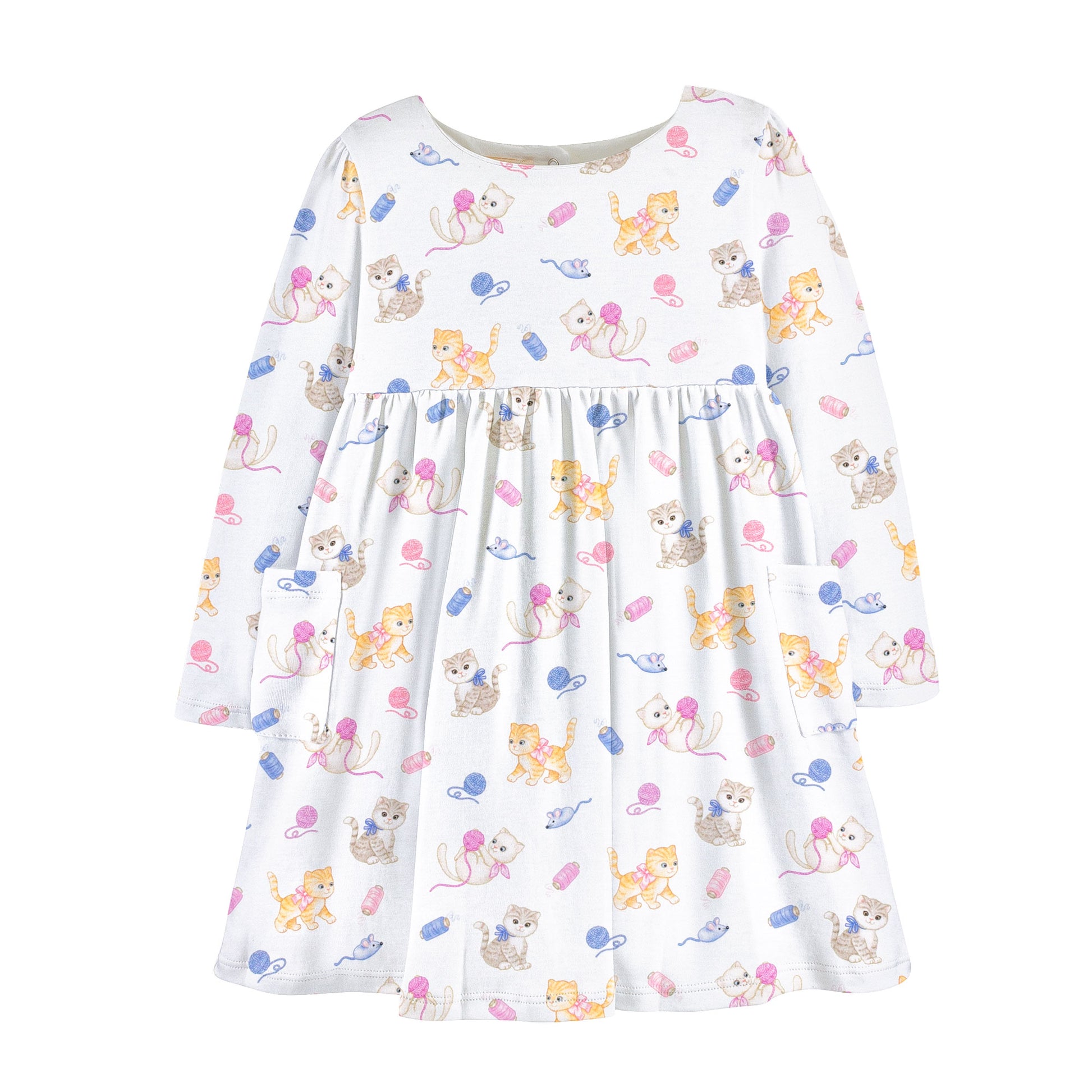 This charming long sleeve dress features an adorable kittens print that adds a touch of playful whimsy. Made from soft Pima cotton, it feels gentle on your little one’s skin while pockets offer fun practicality. Perfect for everyday adventures, this dress brings comfort and cute together in one delightful package.
