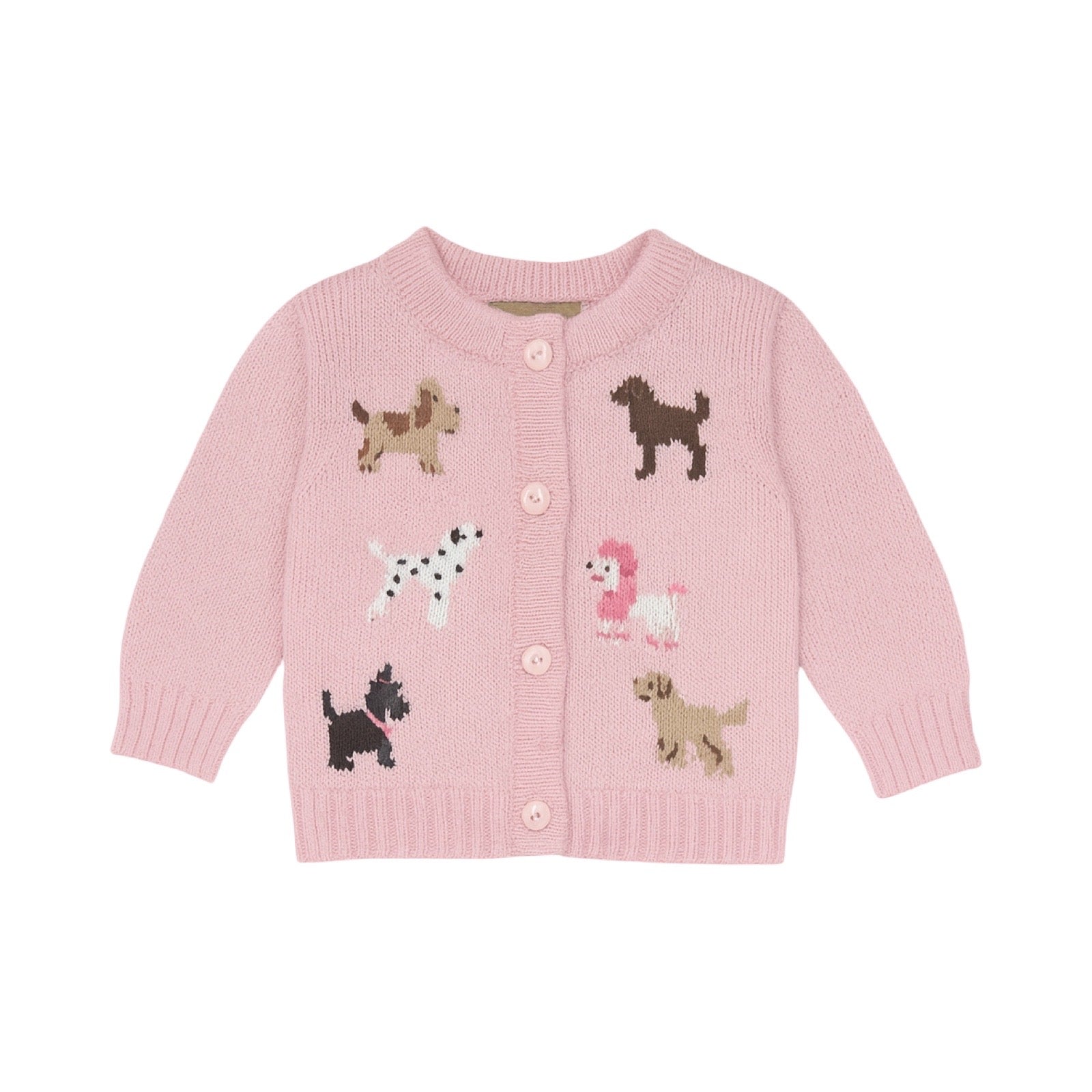 Who let the dogs out? This soft and cozy new light pink cardigan is sure to bring a smile with multiple dog breeds all over the front. With a Bassett Hound, Dalmatian, Scottish Terrier, Chocolate Lab, Poodle, and Golden Retriever, this crew neck cardigan sweater will become a cozy staple in your little girls wardrobe.