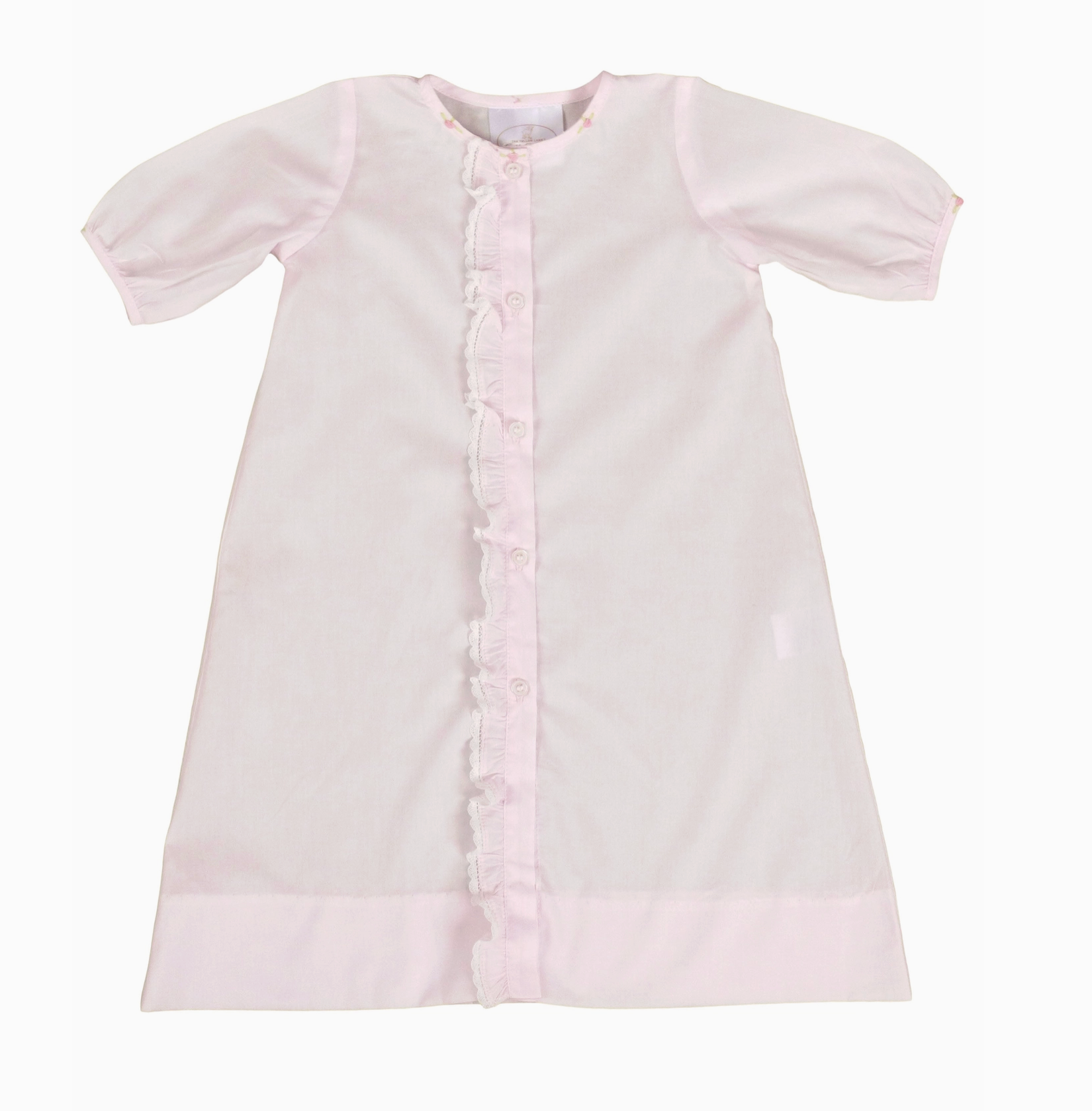 The Linden is our newest baby gown designed for life's sweetest moments. The exquisite daygown is handsewn and hand-embroidered with delicate bullion roses on the neck and sleeves. A sweet ruffle finished with English lace down the front opening provides a touch of timeless charm. Designed with love and tradition in mind, it even comes with a matching diaper cover for a perfectly finished look. A keepsake meant to be treasured for generations, because some pieces are just that special.