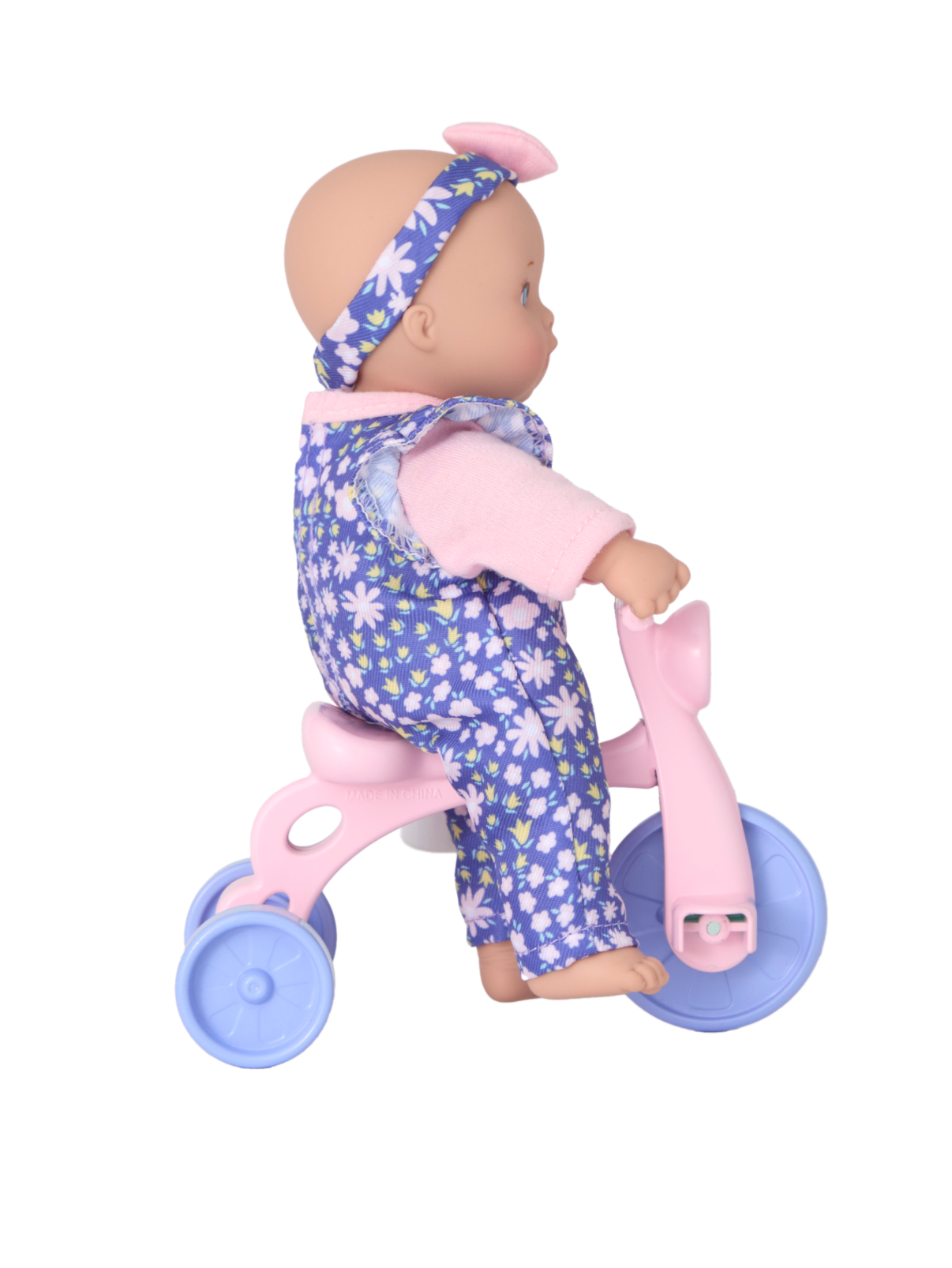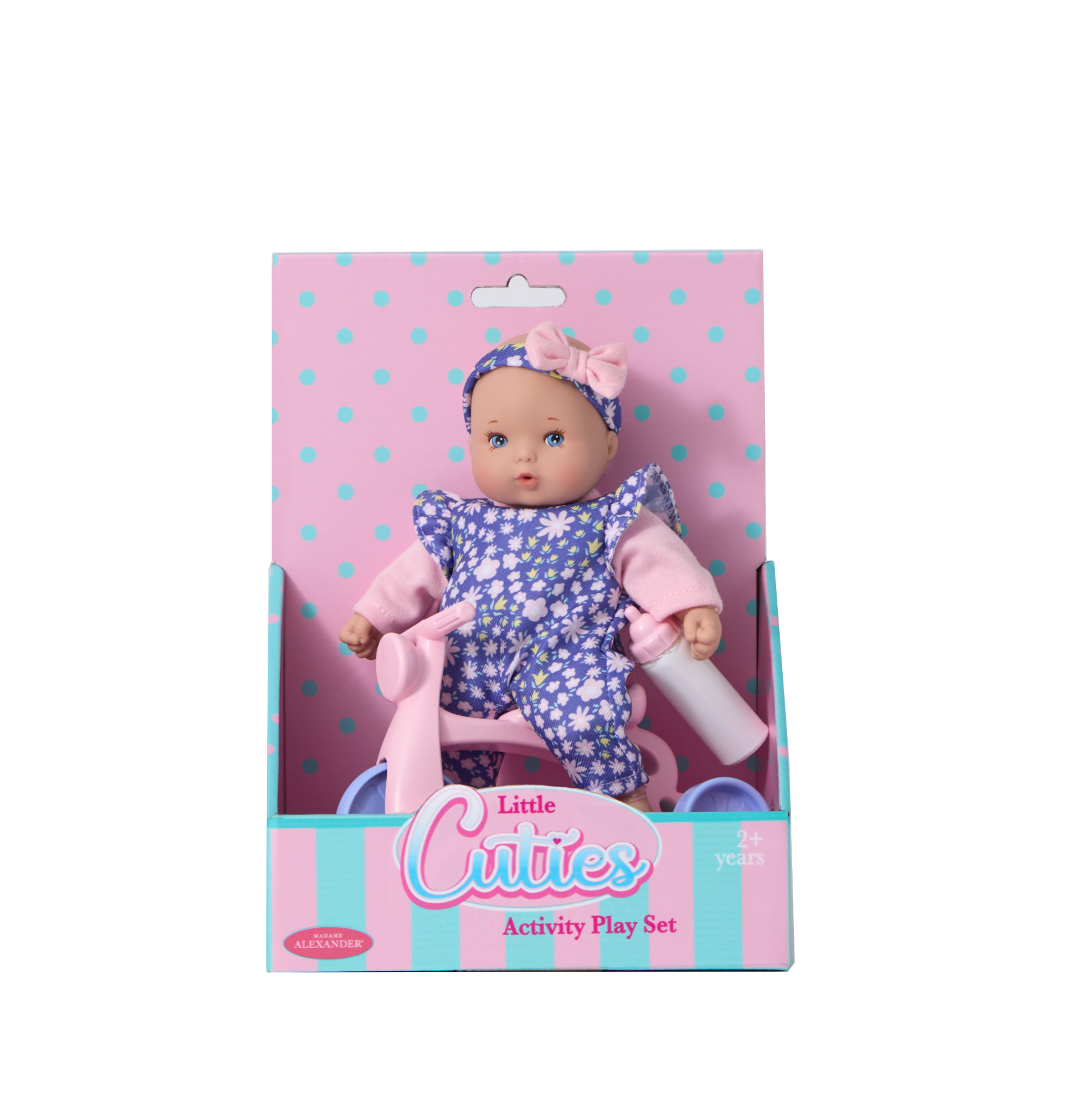 Little Cuties Playsets are here! These 8-inch pals are perfect for any adventure, fitting easily in your pocket or backpack. Trike Playset comes with her very own Tricycle to ride. Dressed in a purple overall with pink starbursts and a matching headband. These pint-sized pals come complete with beautifully painted features, molded head, and soft fabric bodies.