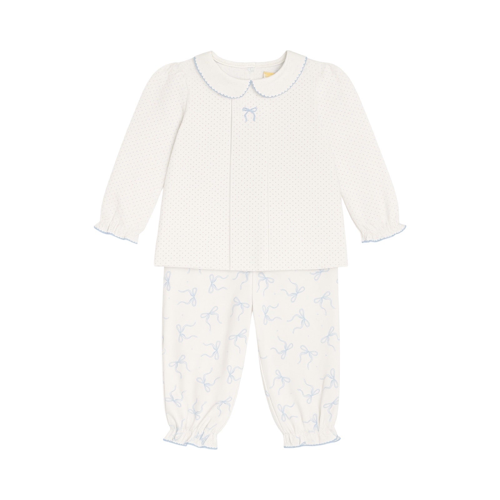 This darling two-piece baby set combines charm and comfort with a long-sleeve pleated top featuring a playful blue polka dot, Peter Pan collar and a sweet bow embroidery. Paired with coordinating printed bow bloomer pants, it’s perfect for your little one’s everyday adventures with a touch of whimsy.