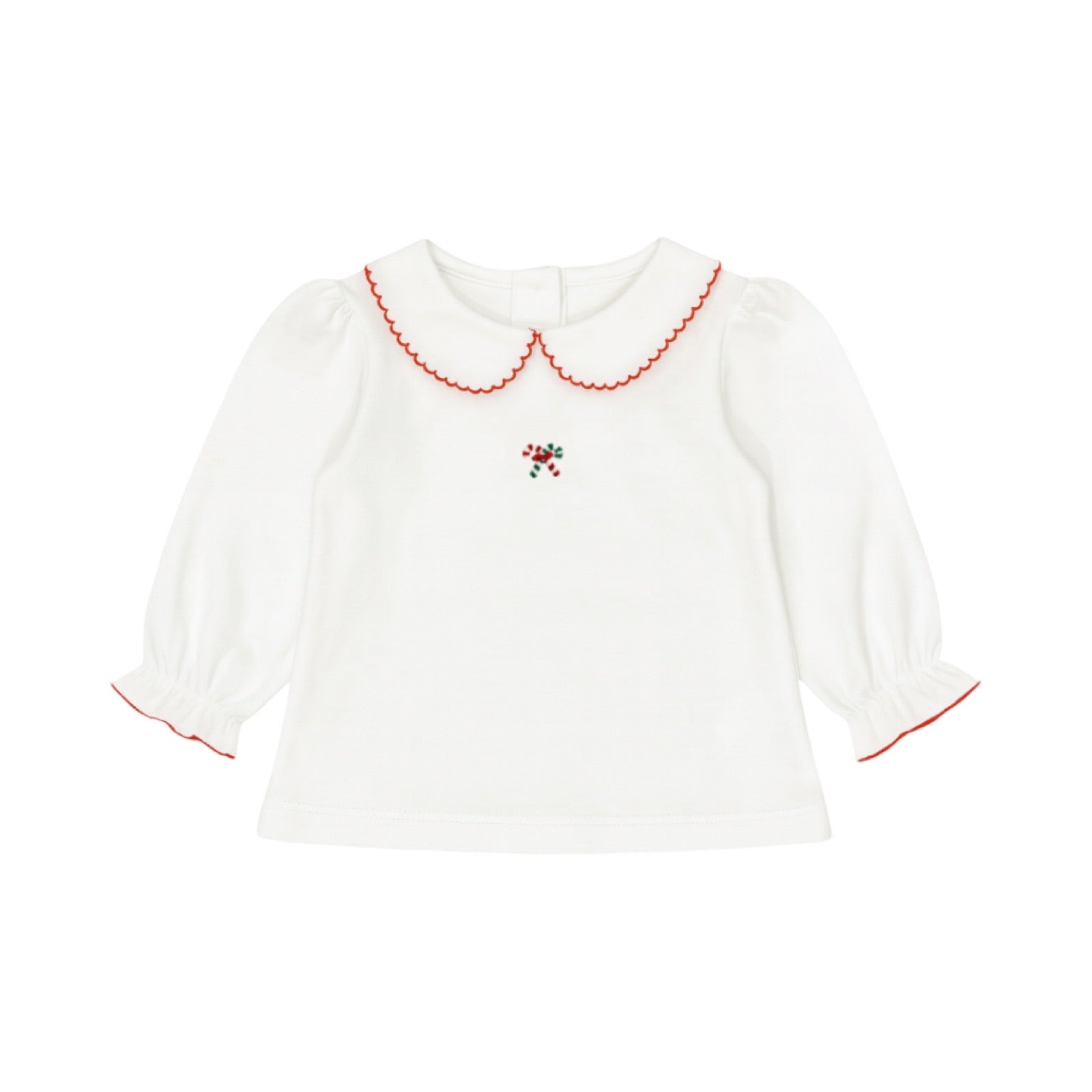 This playful cotton knit top features charming puffed long sleeves and a sweet Peter Pan collar, perfect for her everyday adventures. An embroidered candy cane detail adds a festive touch, while elastic cuffs with delicate ruffles and matching picot trim ensure comfort and style all day long.