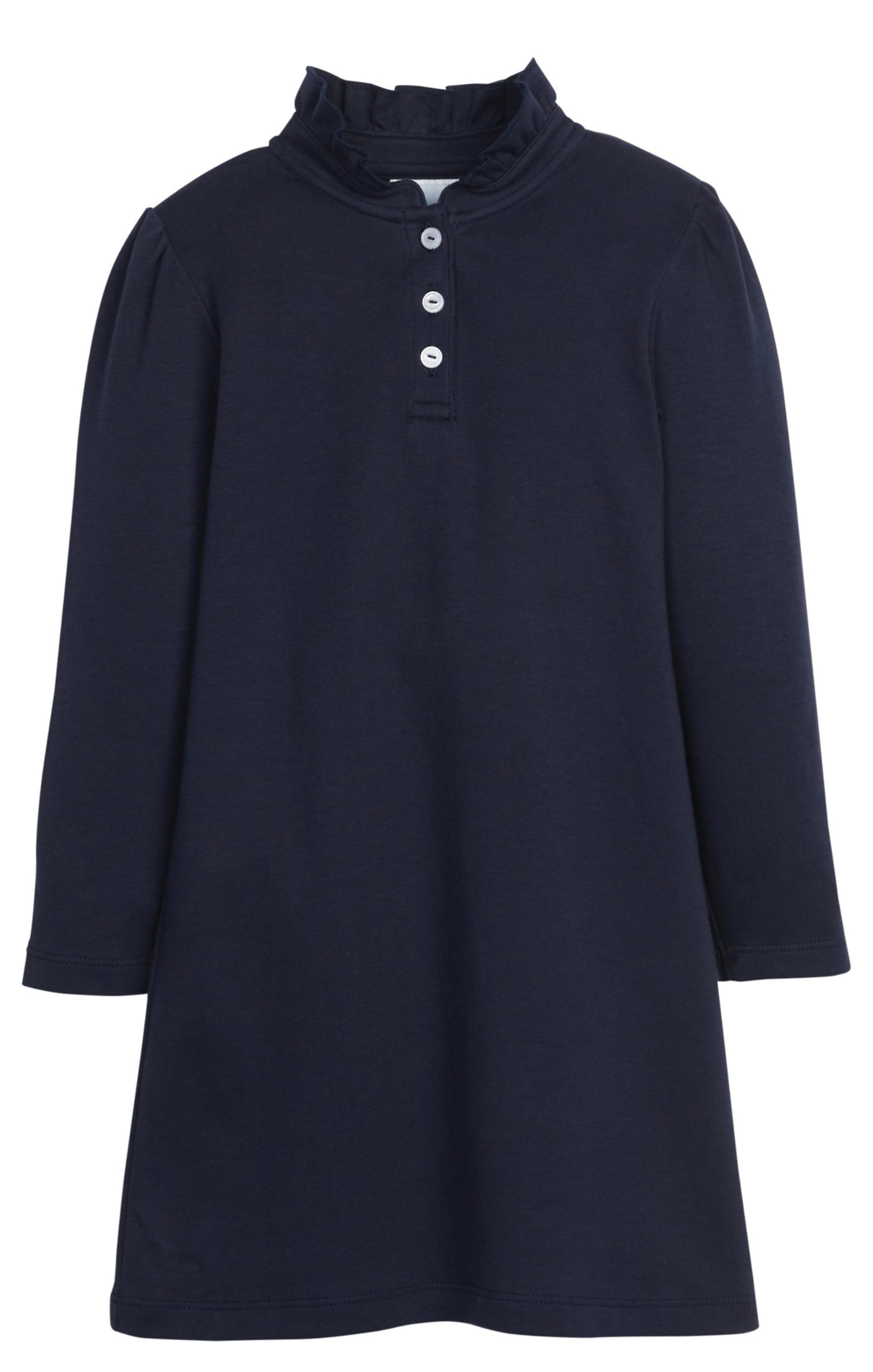 Our Long Sleeve Hastings Polo Dress is sure to become a staple in your daughter's closet - for school and play! This polo shirt dress in navy features a ruffled neckline and subtle gathers at the shoulders with button closures down the front.