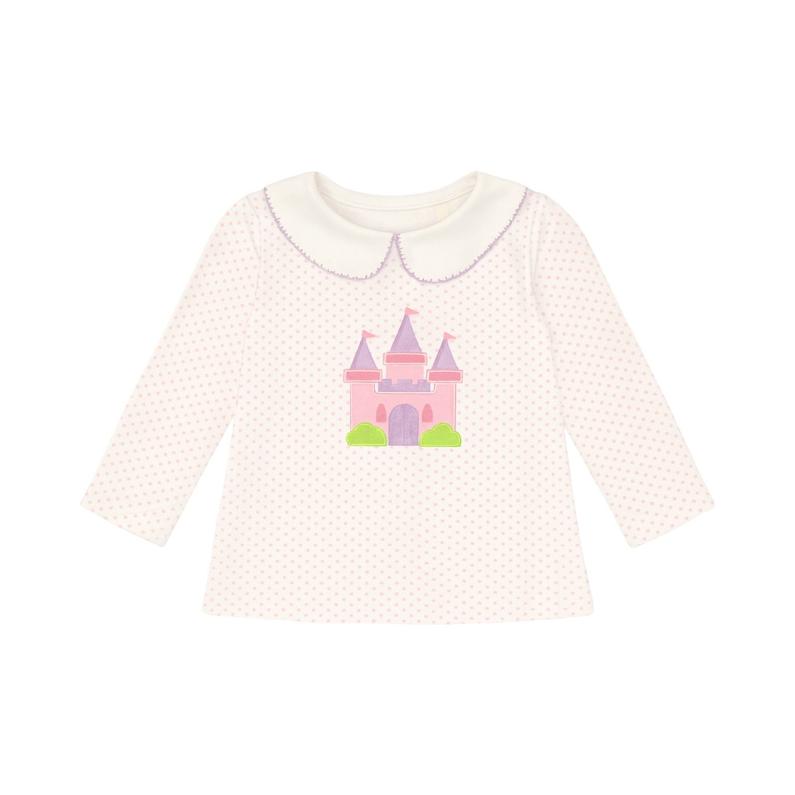 This charming long sleeve top combines playful pleated polka dots with a whimsical castle applique for a touch of fairy tale fun. Made from soft, breathable cotton with a gentle lining, it keeps your little one cozy all day long. The classic Peter Pan collar adds timeless charm, making it perfect for everyday adventures or special occasions. Pair it with our lavender princess collection for an enchanting outfit sure to delight.