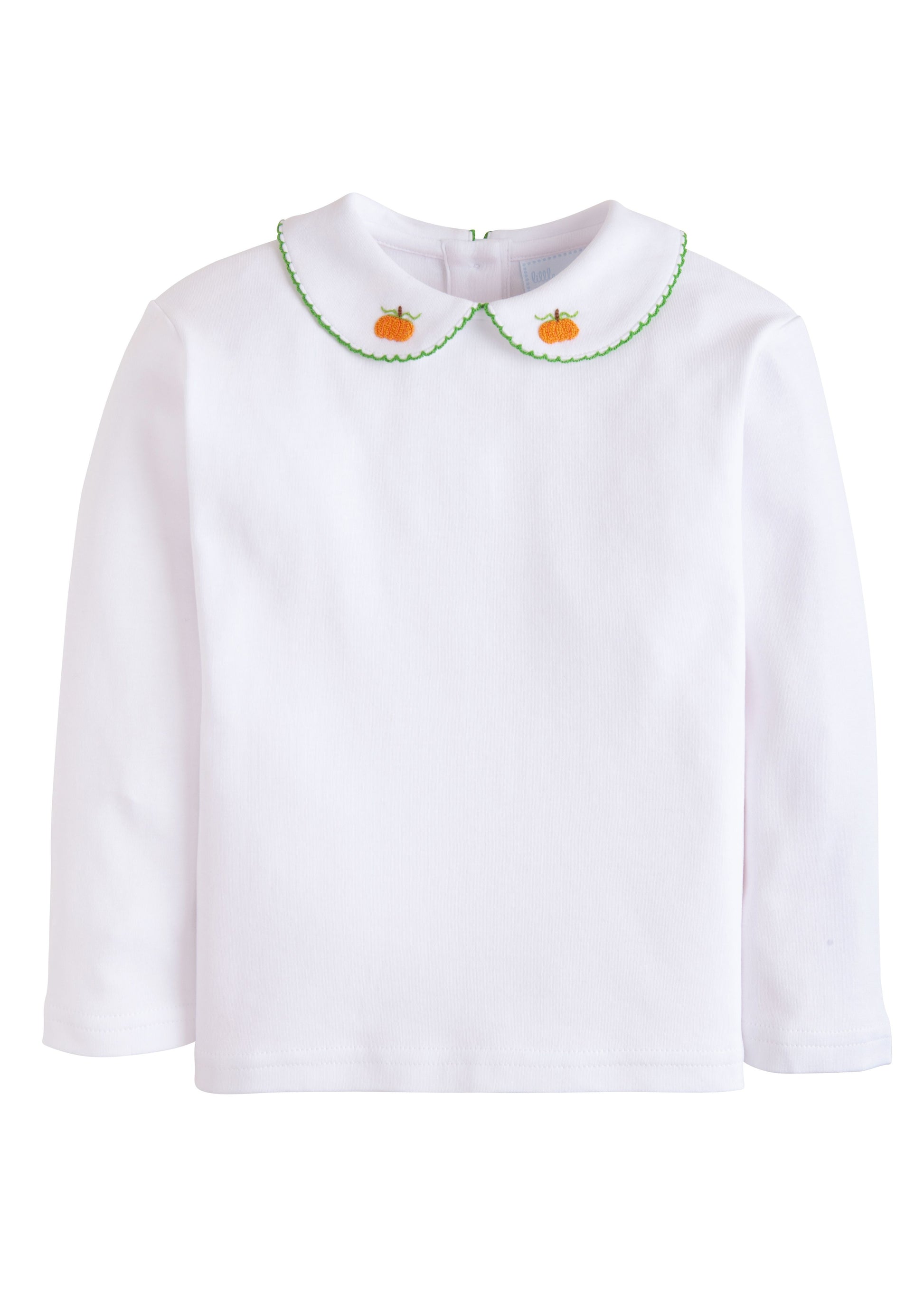 Our Long Sleeve Pinpoint Shirt - Pumpkin is ideal for all your fall activities - from pumpkin carving to hay rides! Stylish and comfortable, this soft cotton shirt features green picot trim and two pinpoint pumpkins on the collar. Pair with our Jack Shortall in Watercress for perfect pumpkin patch pictures!