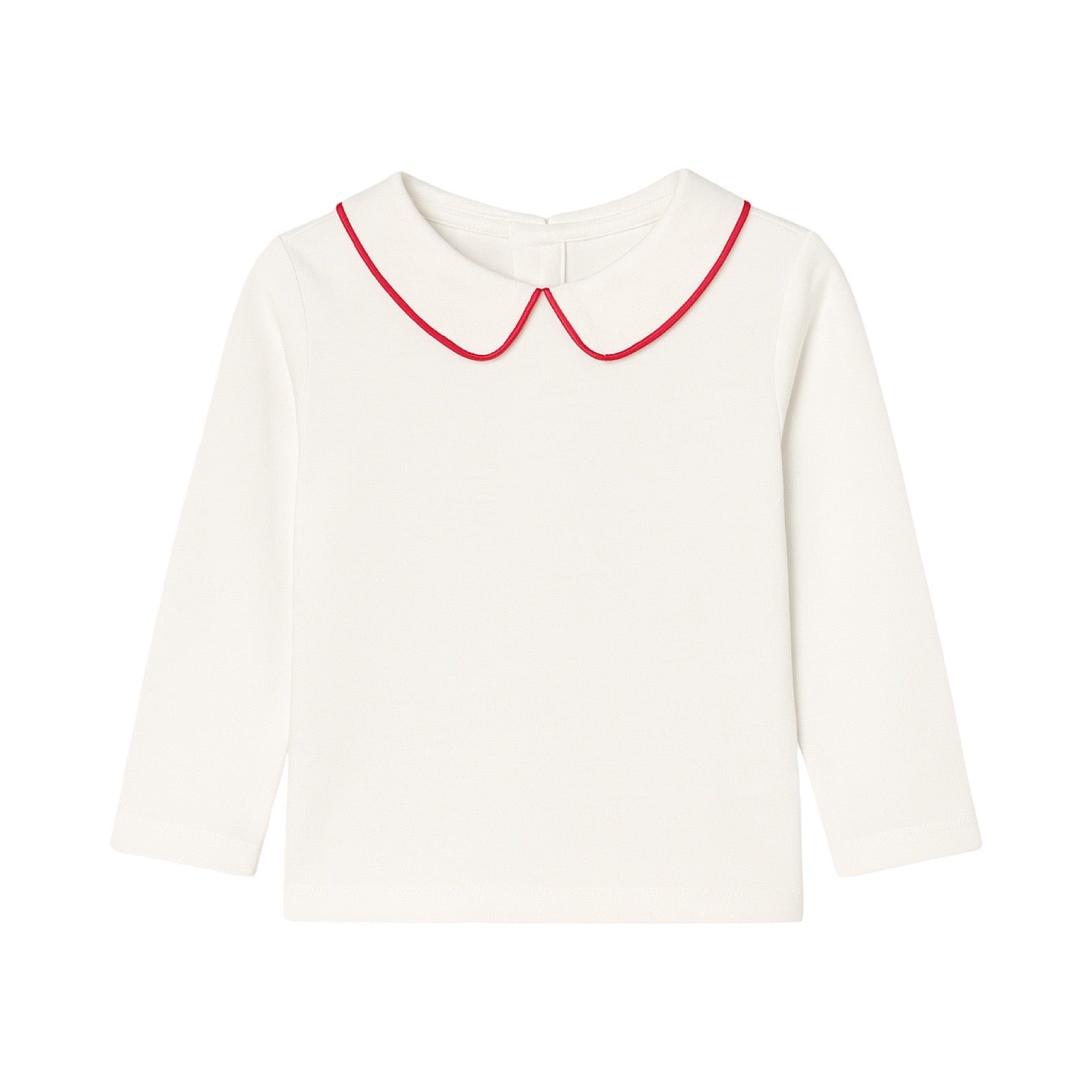 A wardrobe staple perfect for pairing with all your essentials and monogramming. Pointed collar with piping trim. Buttons at the back neck.