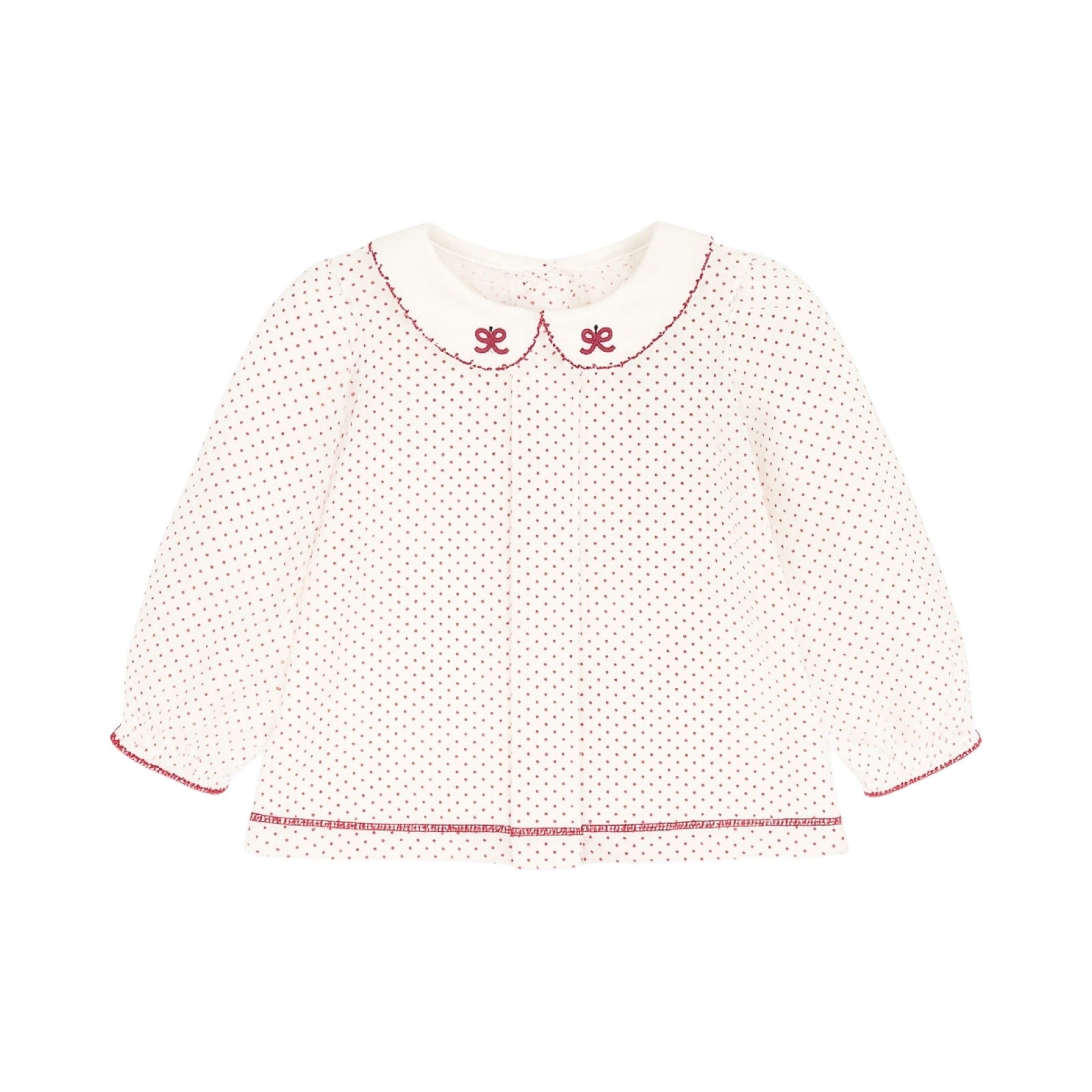 This adorable long sleeve swing top features playful pleated polka dots and embroidered holiday bows on the collars, crafted from soft, breathable cotton to keep little ones comfy all day. Sweet ruffles at the wrists and a charming Peter Pan collar add a whimsical touch, perfect for twirling and fun-filled adventures. Pair it effortlessly with our red leggings or bloomers for an outfit that’s as easy to love as it is to wear.