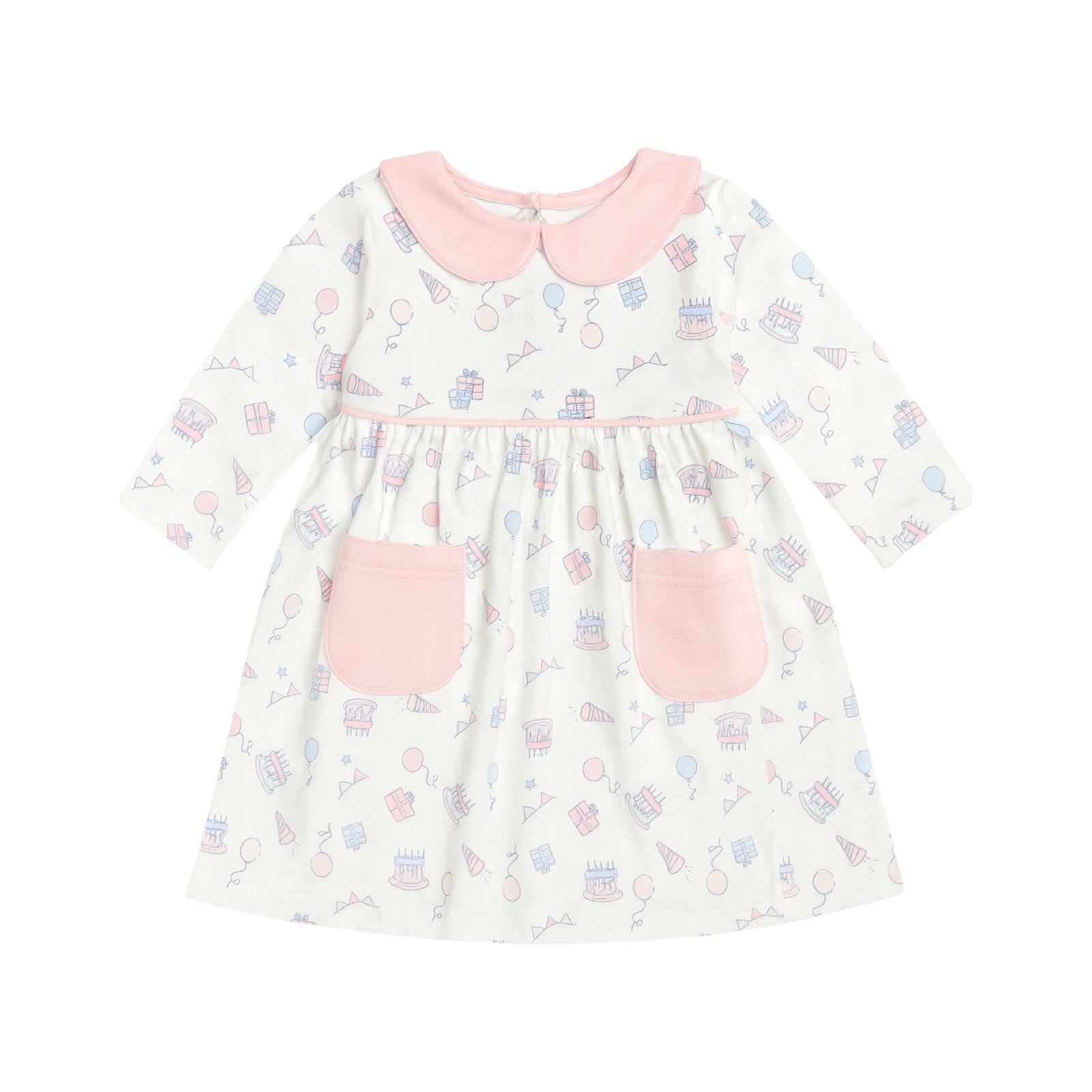 This playful long sleeve dress blends comfort and charm with its soft cotton fabric and classic Peter Pan collar. Adorned in a playful birthday print and everyone's favorite- POCKETS!- it’s perfect for any birthday celebration moment.