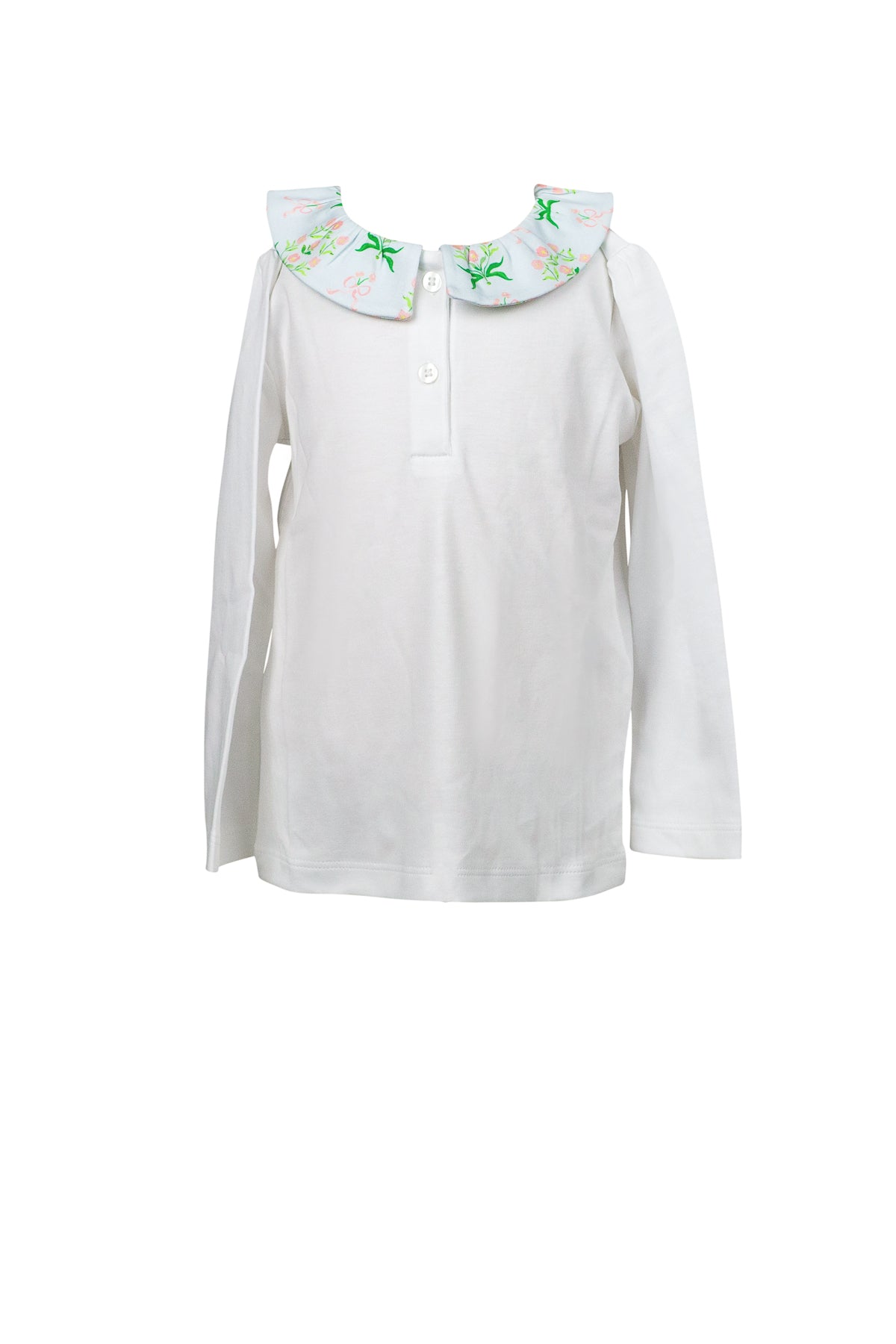 Dress your little one in cozy charm with the Margot Long Sleeve Collar Shirt. Crafted from the softest pima fabric, this white top features a collar adorned with the margot fabric; a soft blue adorned with sweet pink florals. Combined with the Margot Scallop Skort, this playful set is perfect for fall playtime, combining comfort and delicate style for your precious girl’s everyday adventures.