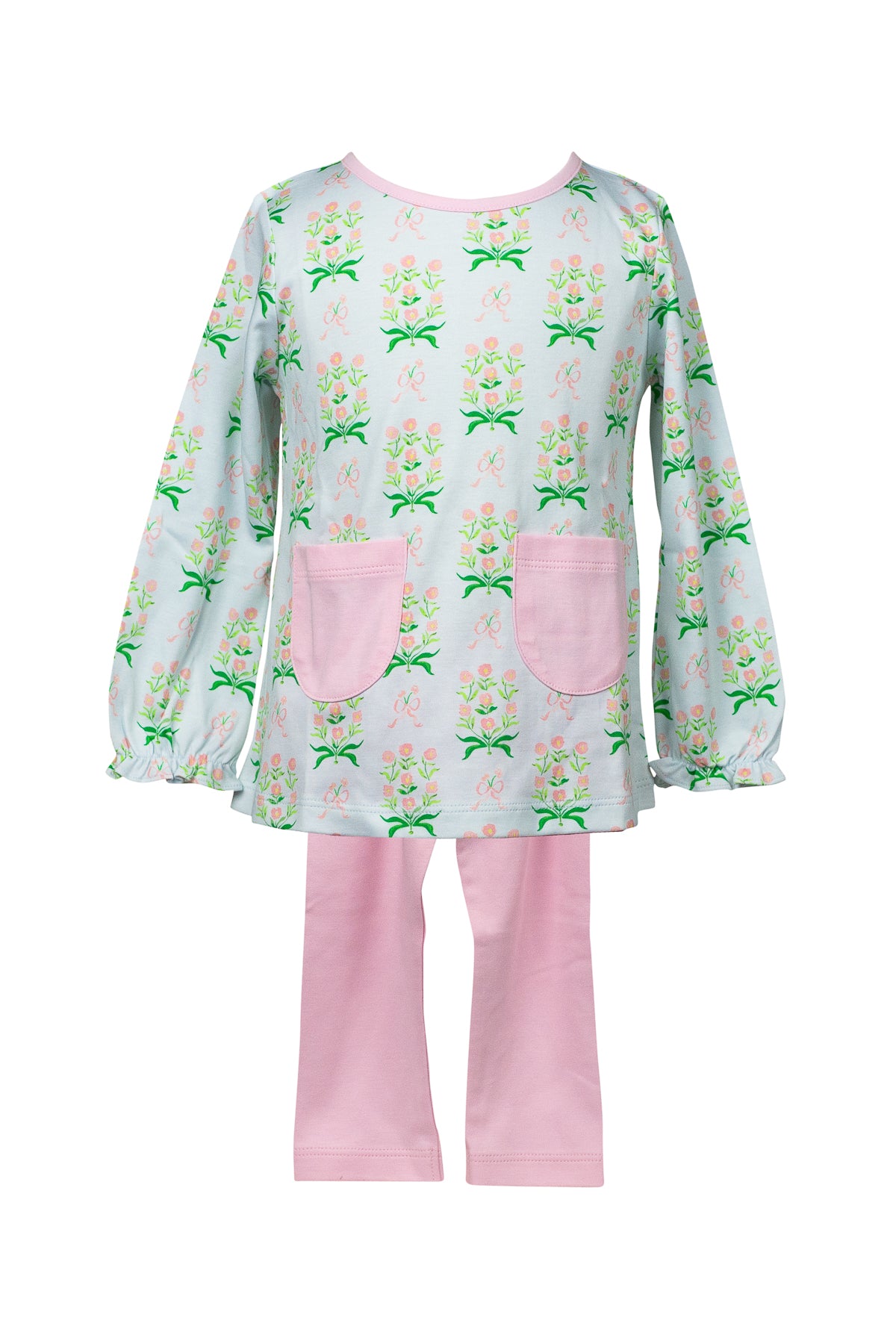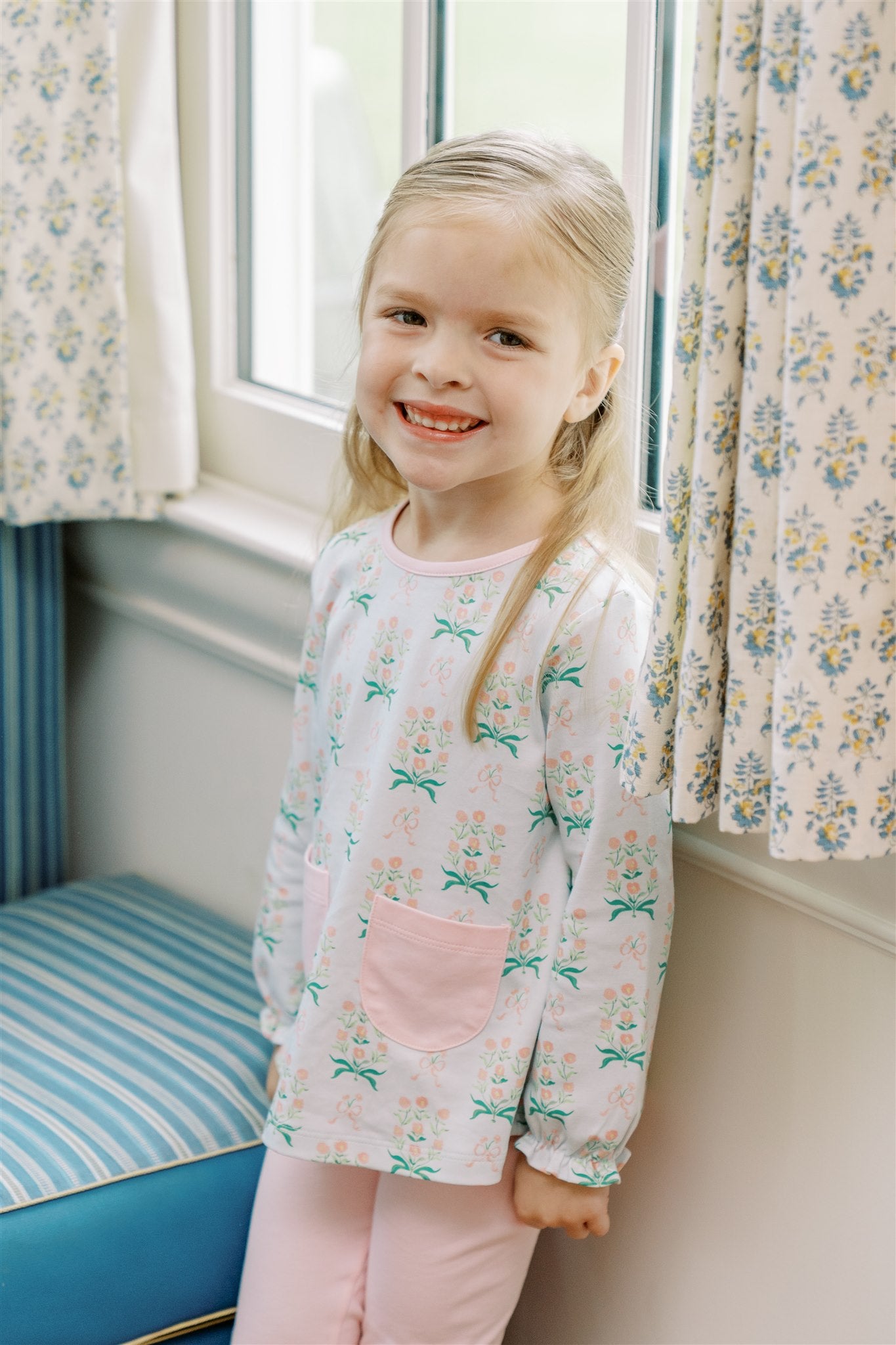 Dress your little one in cozy charm with the Margot Long Sleeve Tunic Set. Crafted from the softest pima fabric, it features a soft blue top adorned with sweet pink florals and pink pockets paired with coordinating pink leggings. This playful set is perfect for fall playtime, combining comfort and delicate style for your precious girl’s everyday adventures.