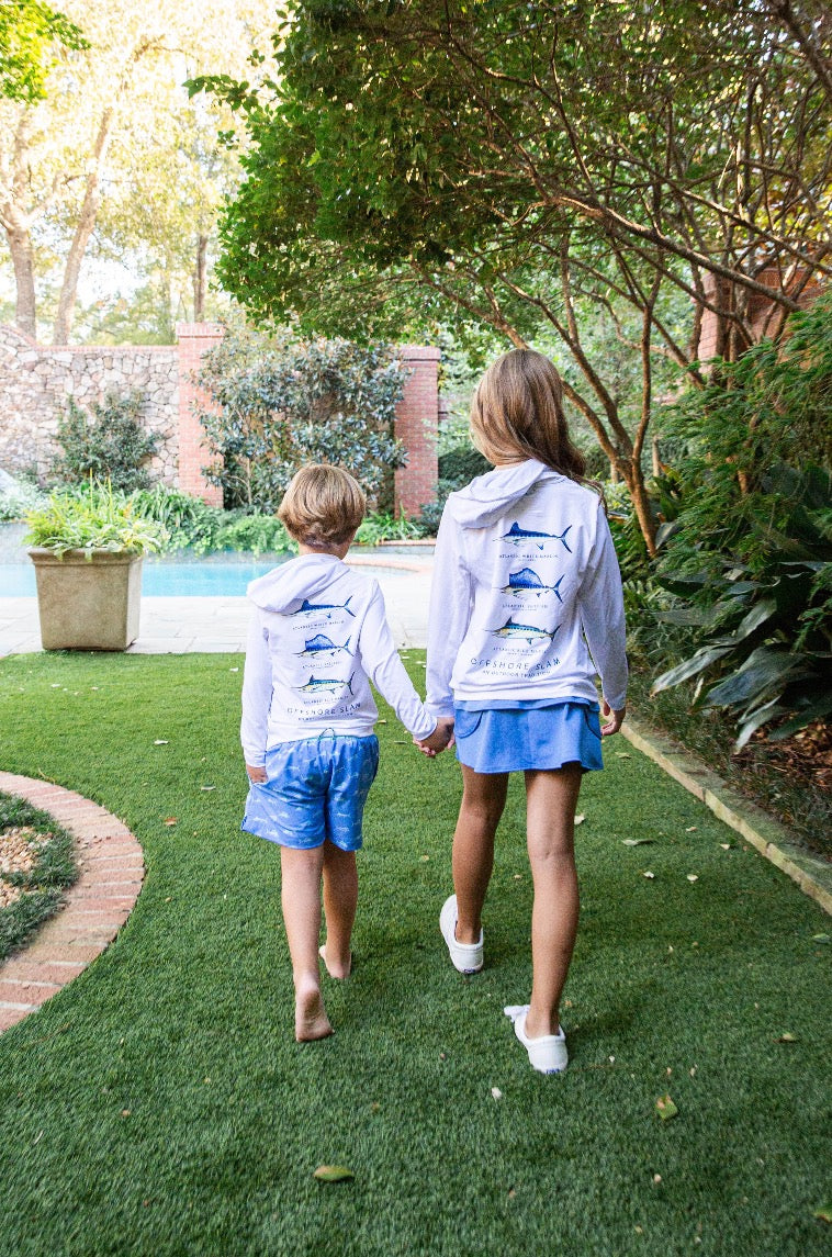 Our Boys Boogie Board Swim trunks in Fish Print on Marina Blue are made of soft, itch free fabric that boys and toddlers crave! Updated side slits and 4 way stretch fabric will provide more movement for your little guy this season! PRODOH Swim trunks are lightweight and fast drying and feature an anti chafing boxer brief liner.Side seam pockets are mesh lined so sand stays out but shells and bait stay put. Pair with a PRODOH sun protective Reef Rash Guard Swim Shirt from our boy's swimwear line or a lightweight youth performance t-shirt. Swim Trunks are available in custom designed fabric prints in sizes 12 Month - Youth Large 12/14 for toddlers and boys.