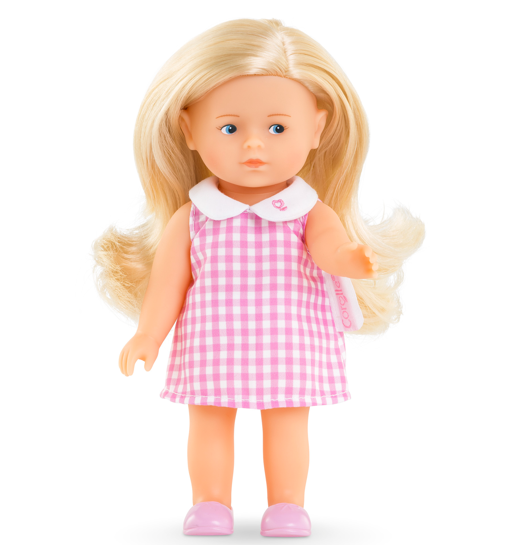 Meet Mini Corolline Rosy, a petite doll with a vanilla-scented all-vinyl body, blue eyes, and silky blonde hair. She comes dressed in a charming gingham dress and can easily fit in a bag or backpack, making her the perfect companion for your child on-the-go. The ideal gift for any occasion!