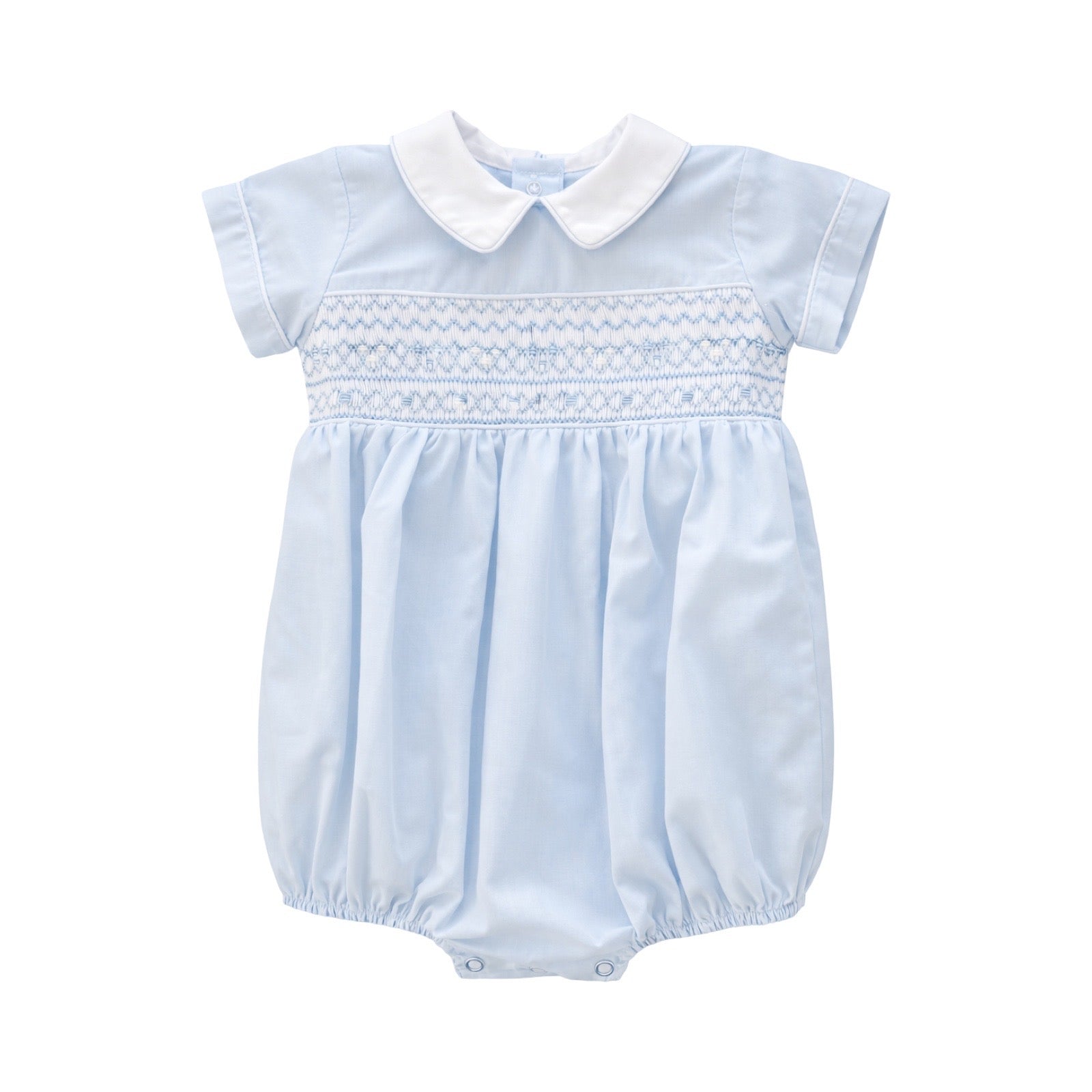 Timeless elegance meets playful charm in this classic blue bubble featuring intricate hand-smocked detailing across the chest. The structured collar and perfectly proportioned silhouette make it an instant favorite for portrait sessions, Easter celebrations, or as a treasured gift. Crafted with care for those special moments that deserve something truly special.