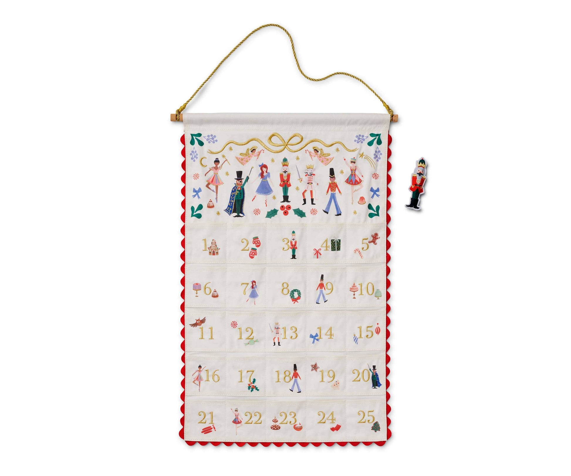 Countdown to Christmas with our fabric advent calendar, with embroidered designs and a felt Nutcracker figurine to move from day to day. The calendar hangs from a dowel with a gold cord for display.