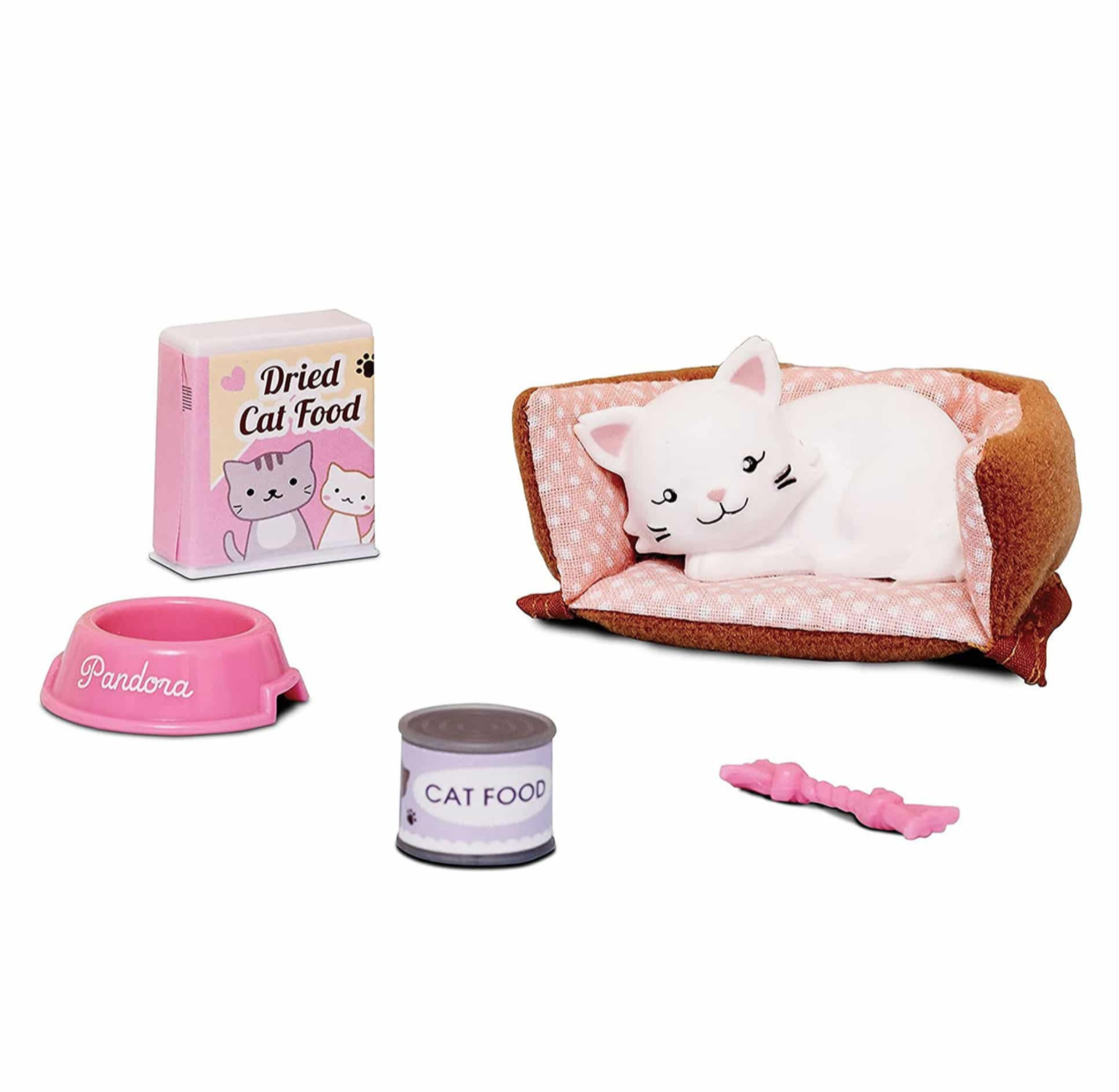 Meet Lottie's new companion, perfect for your little one to learn how to extend their kindness and care. Pandora is a cuddly cat that will add cuteness and a sense of nurturing to playtime. This set includes Pandora the cat, a cat bed, canned cat food, dry cat food, a milk bowl, and a mini rope toy.