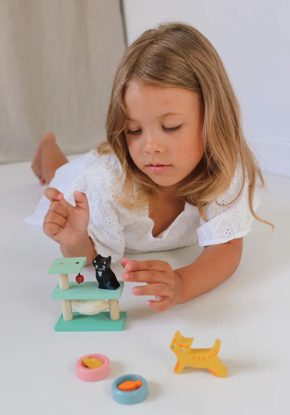 2 little cats, black and ginger with a play table and ball to amuse themselves. 2 differently colored bowls each with a fish for dinner! Suitable for all the wooden dolls houses, as scaled to 1:12.