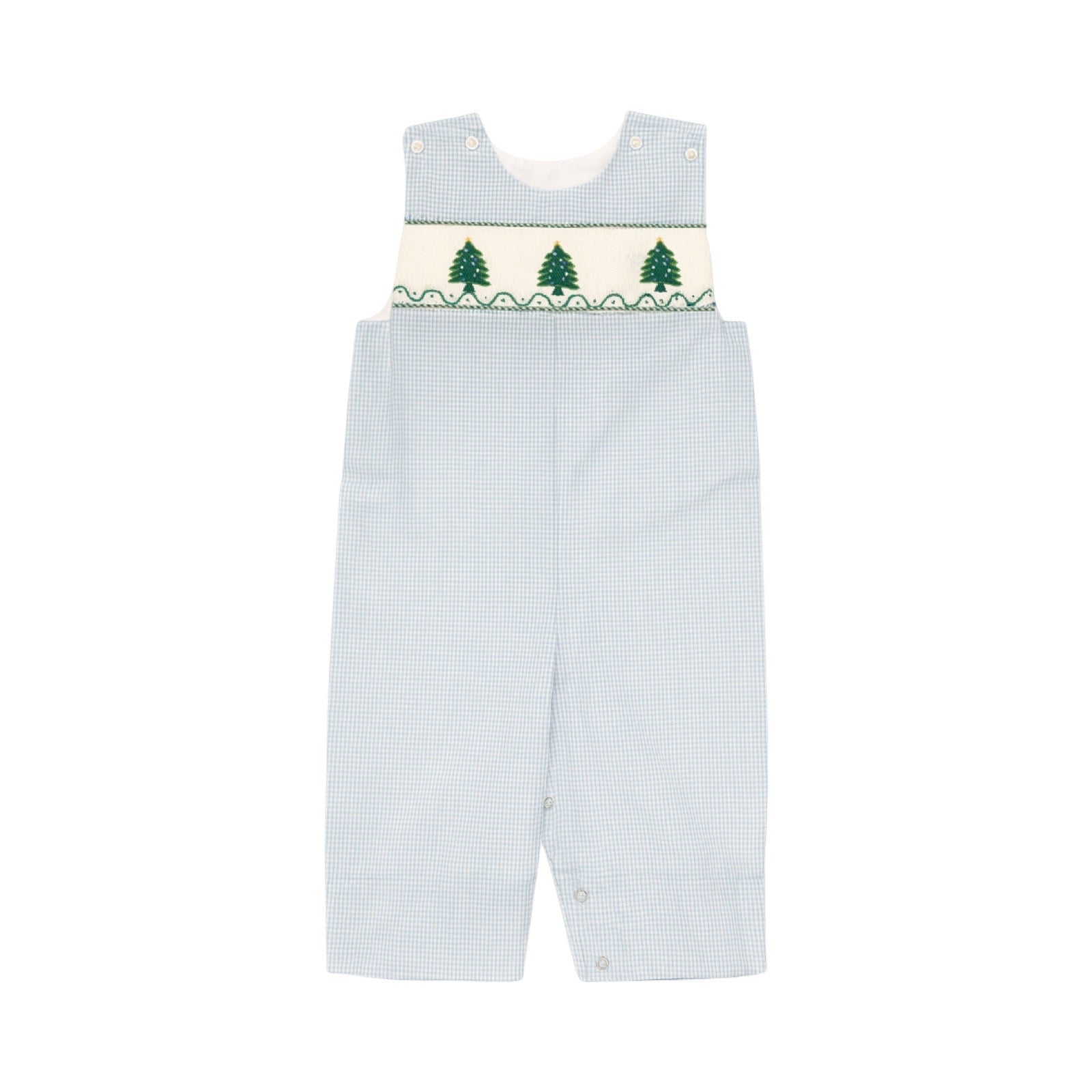 Dress your little one in festive charm with the Peter Smocked Longall, featuring a darling blue gingham fabric adorned with beautiful smocked Christmas trees. Designed for easy dressing, it has buttons at the shoulders and snaps at the legs, making diaper changes a breeze. This playful longall brings holiday spirit and comfort together perfectly.