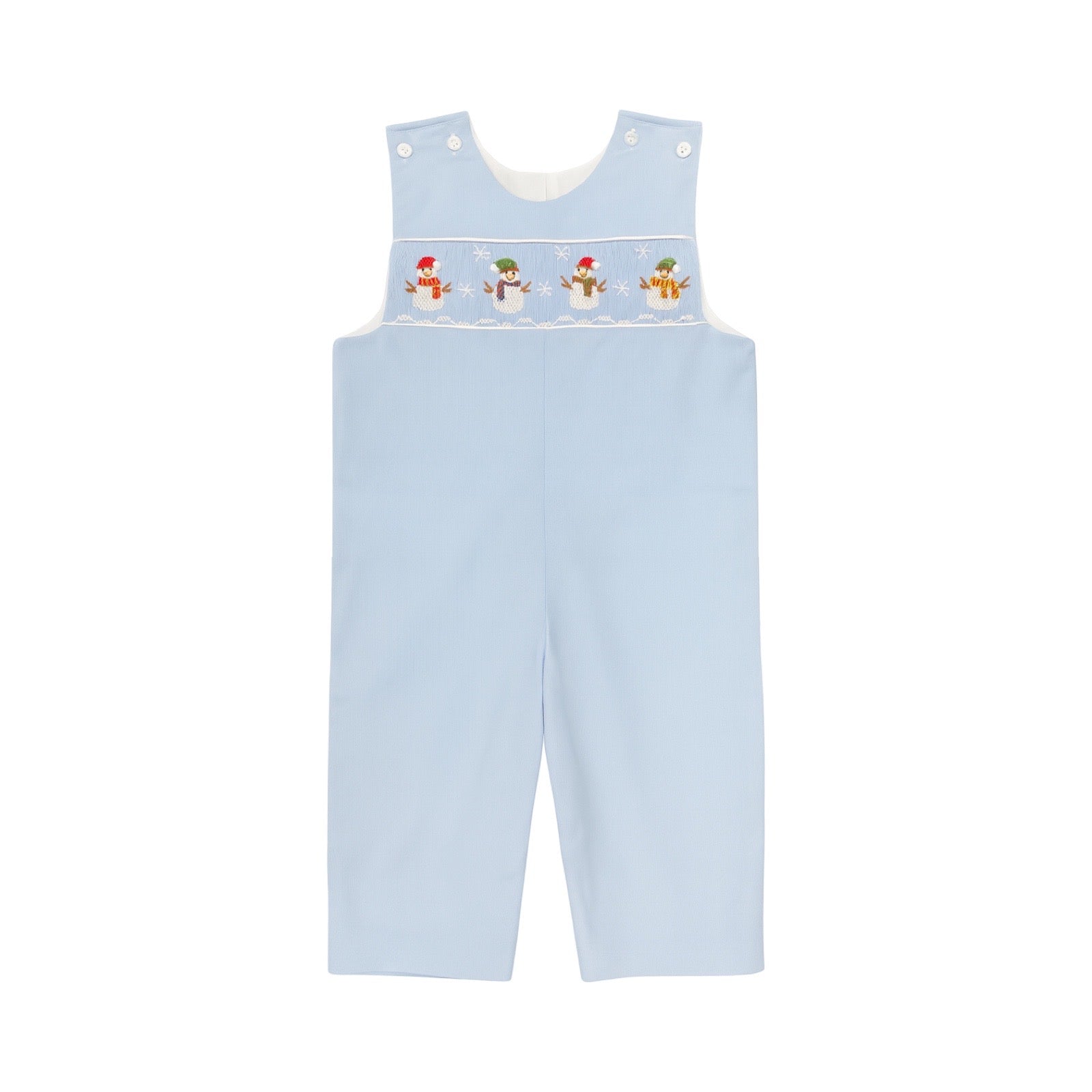 Dress your little one in festive charm with the Peter Smocked Longall, featuring a beautiful blue fabric adorned with beautiful smocked snowmen. Designed for easy dressing, it has buttons at the shoulders and snaps at the legs, making diaper changes a breeze. This playful longall brings holiday spirit and comfort together perfectly.