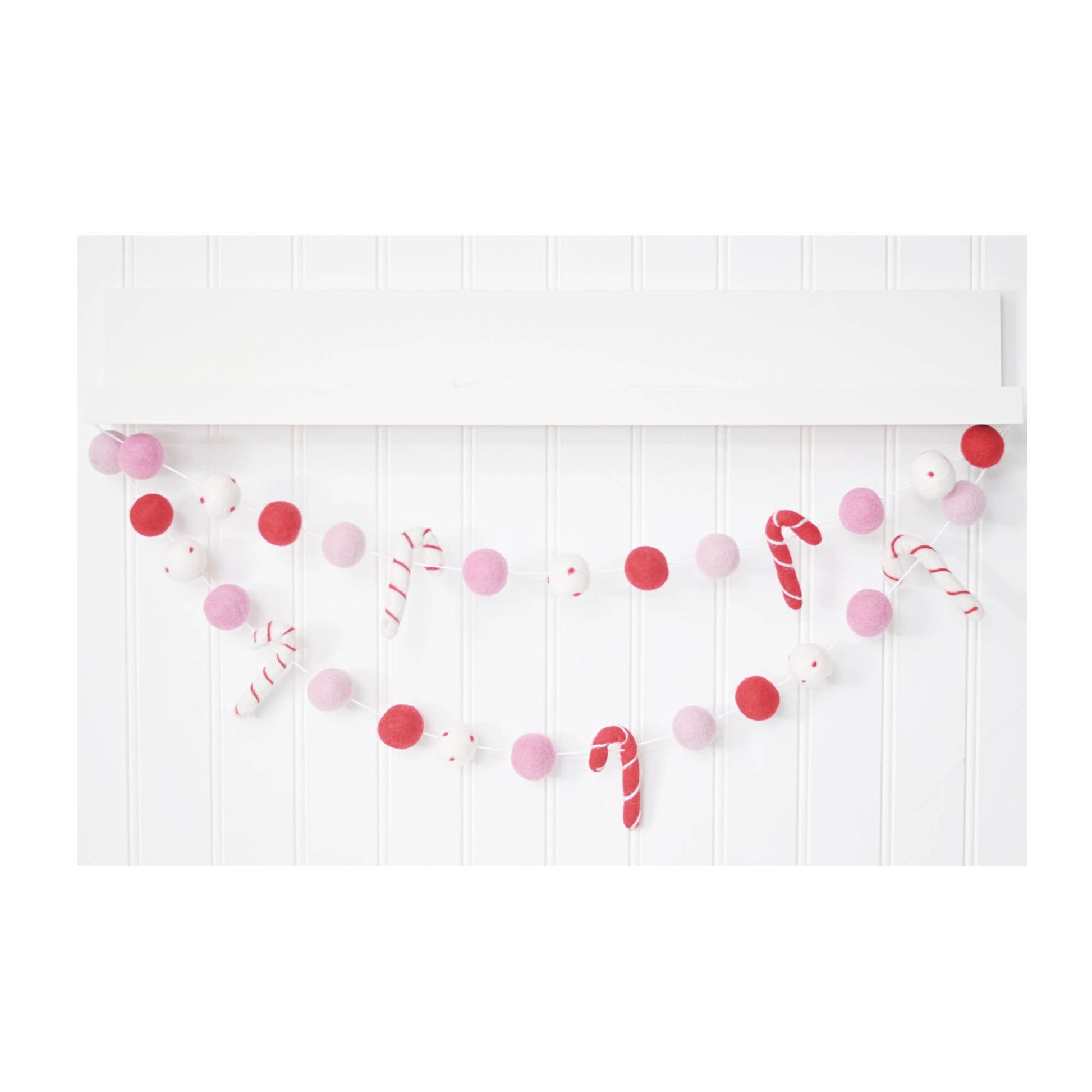 The little details: 2.5 cm balls and 7 cm felt candy canes made of 100% wool -Strung on white cotton string -Guaranteed to arrive tangle-free! Felt ball colors: Light Pink, Red, White with red polka dots, and Rose Length is 6 feet with 24 felt balls and 6 felt candy canes