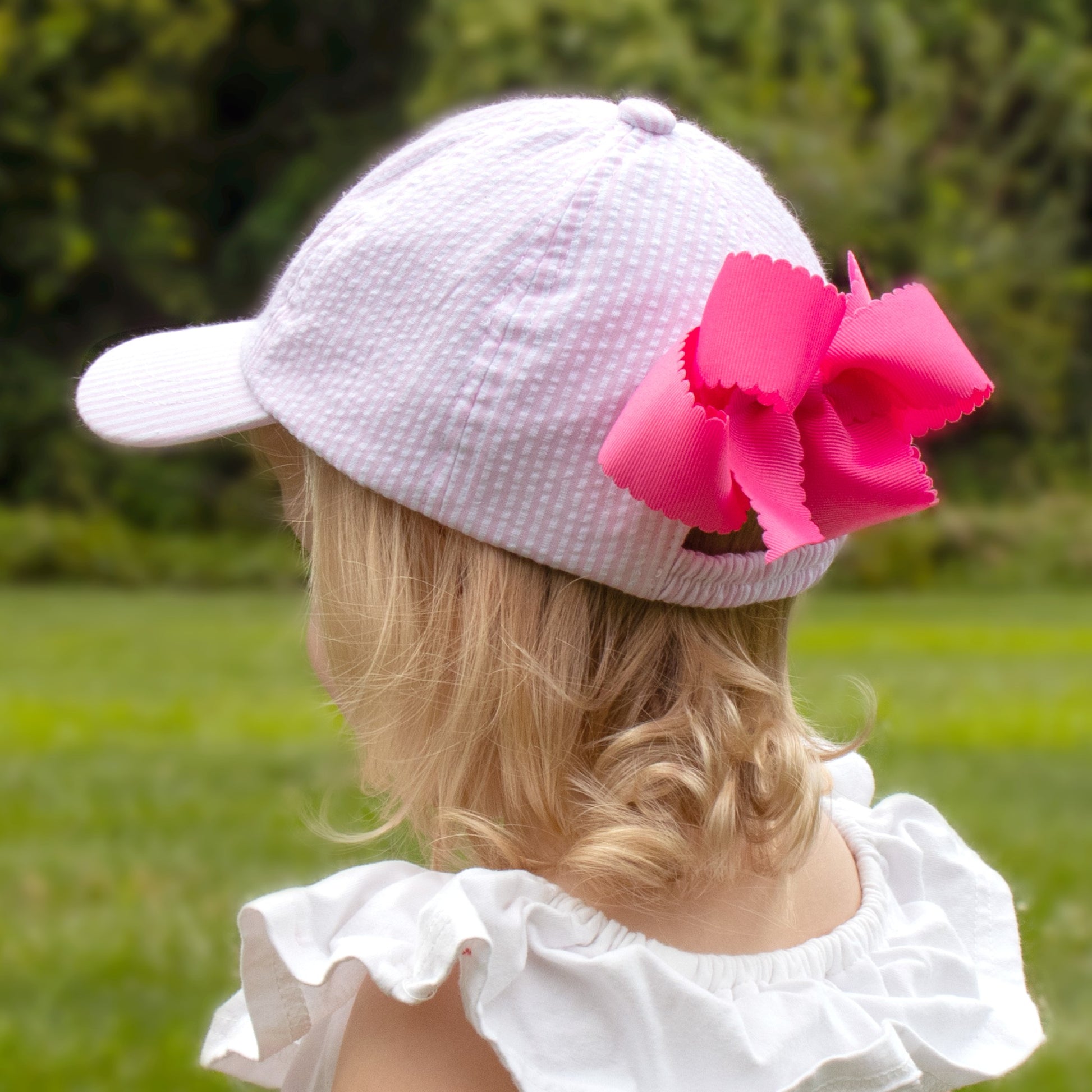 With UPF 50+ protection, this cotton-poly blend seersucker baseball hat helps ensure your little ones stay safe in the sun. They'll look so cute and stay comfy too! This cap features an add a bow slot in the back.