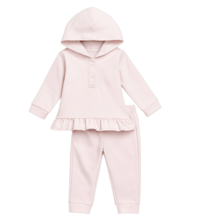This two piece set is a stylish and comfortable outfit for your little girl. The light pink long sleeve hooded top has two buttons at the neck and a ruffle along the bottom hem. The hood is lined in pink and white stripe fabric. The matching pants finish the outfit perfectly.