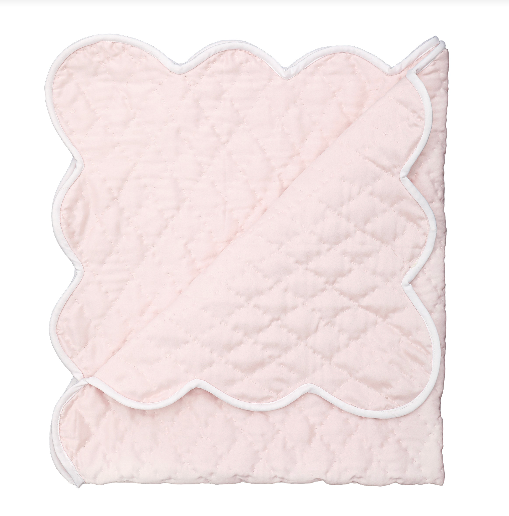 A beautiful hand quilted satin baby blanket with scalloped edge to keep them wrapped and snuggled.