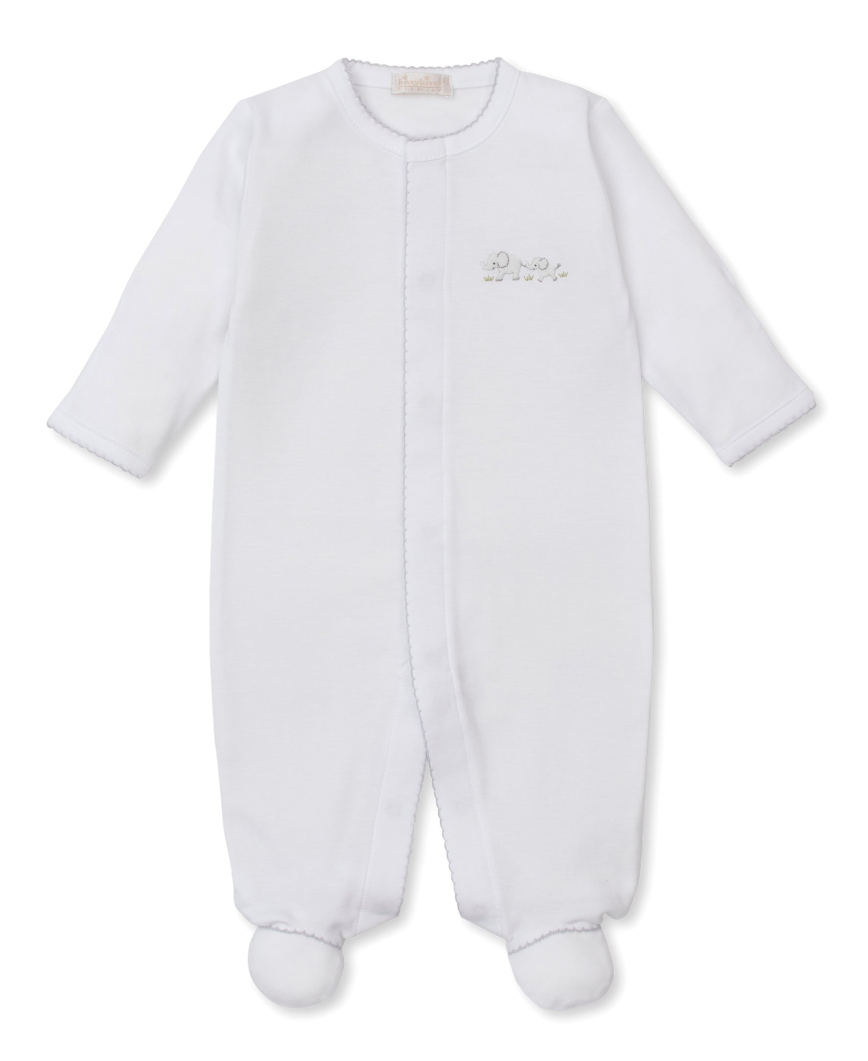 A special footie that is perfect for welcoming new babies. This white footie is made of super soft Pima cotton featuring a sweet little elephants embroidered with silver details and trim.
