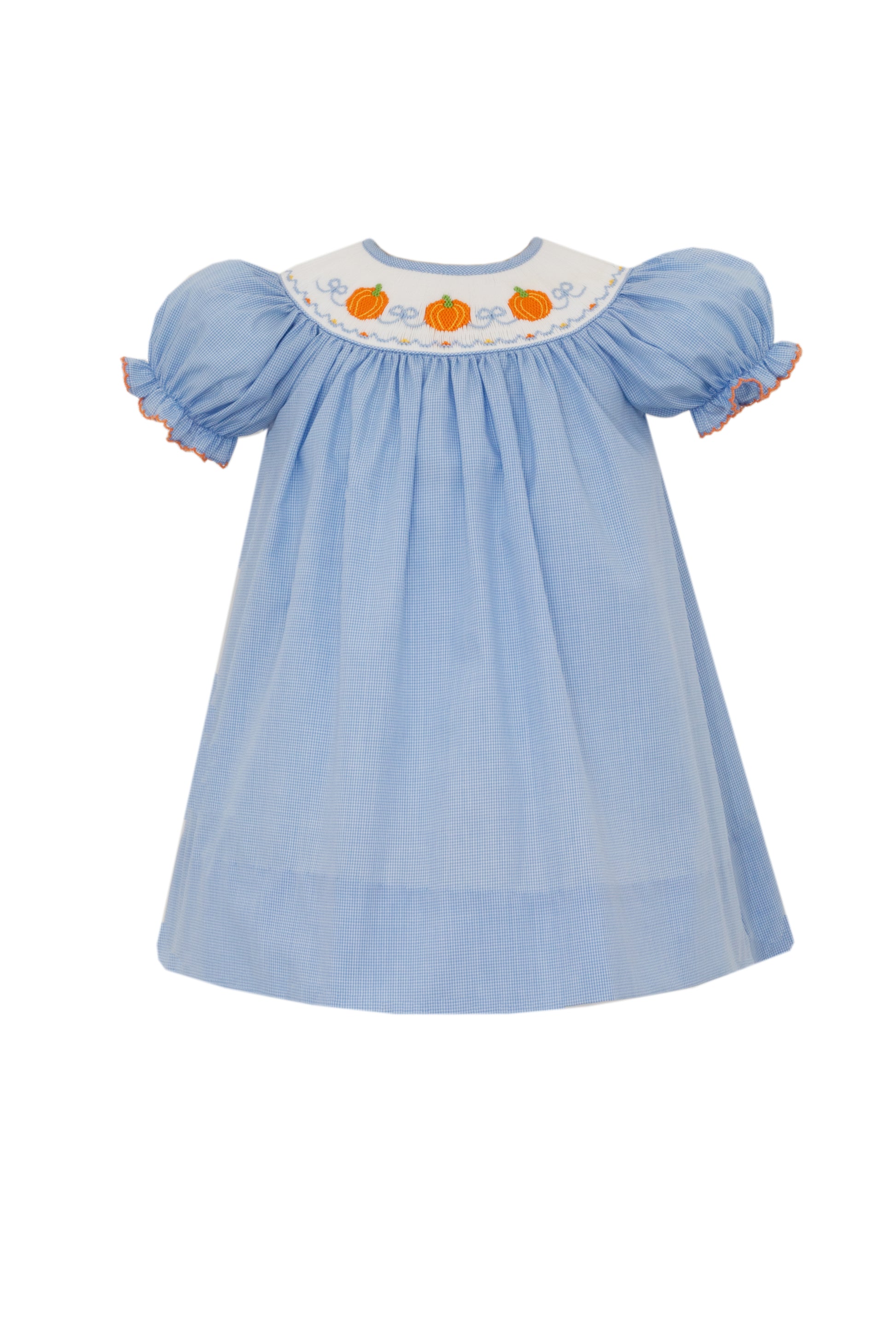 This charming Pumpkin Blue Microcheck Bishop Dress brings playful style to any little girl's wardrobe. Featuring a delicate blue microcheck pattern and classic bishop sleeves, it offers both comfort and timeless appeal. Perfect for festive occasions or everyday fun, this dress adds a touch of whimsy and sweetness to her look.
