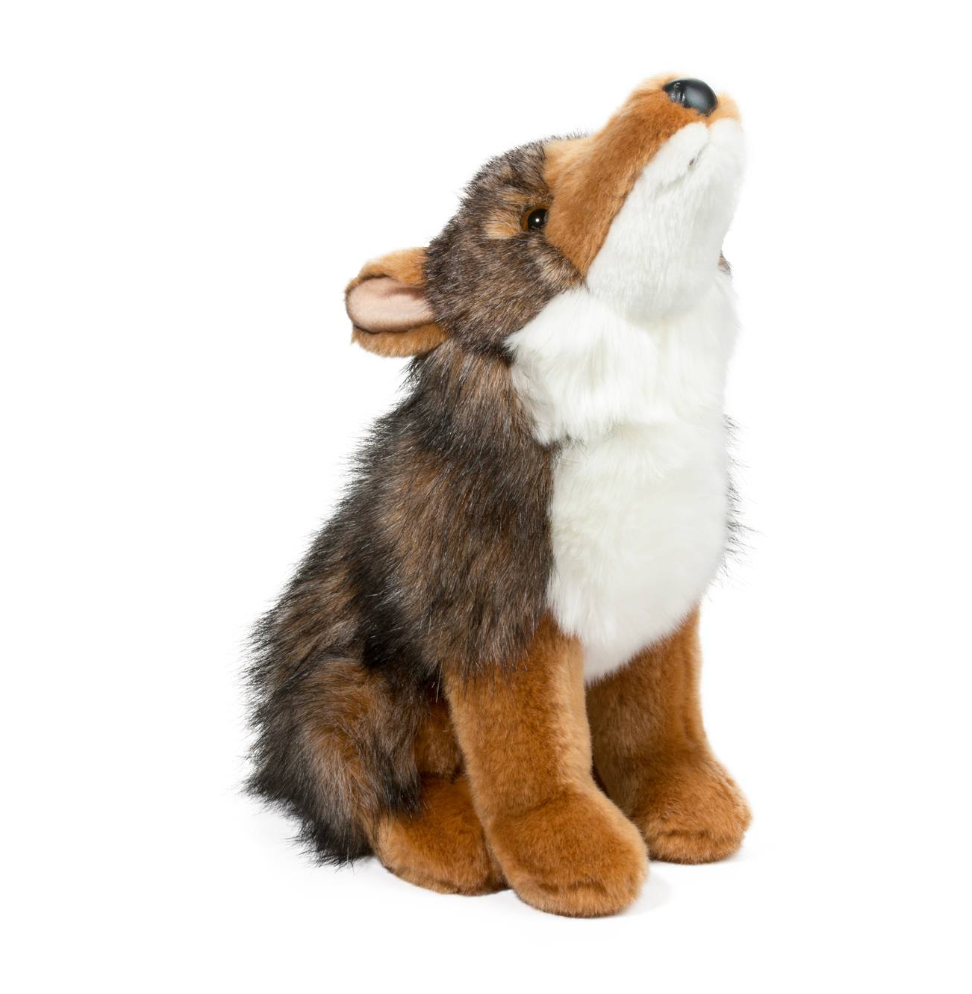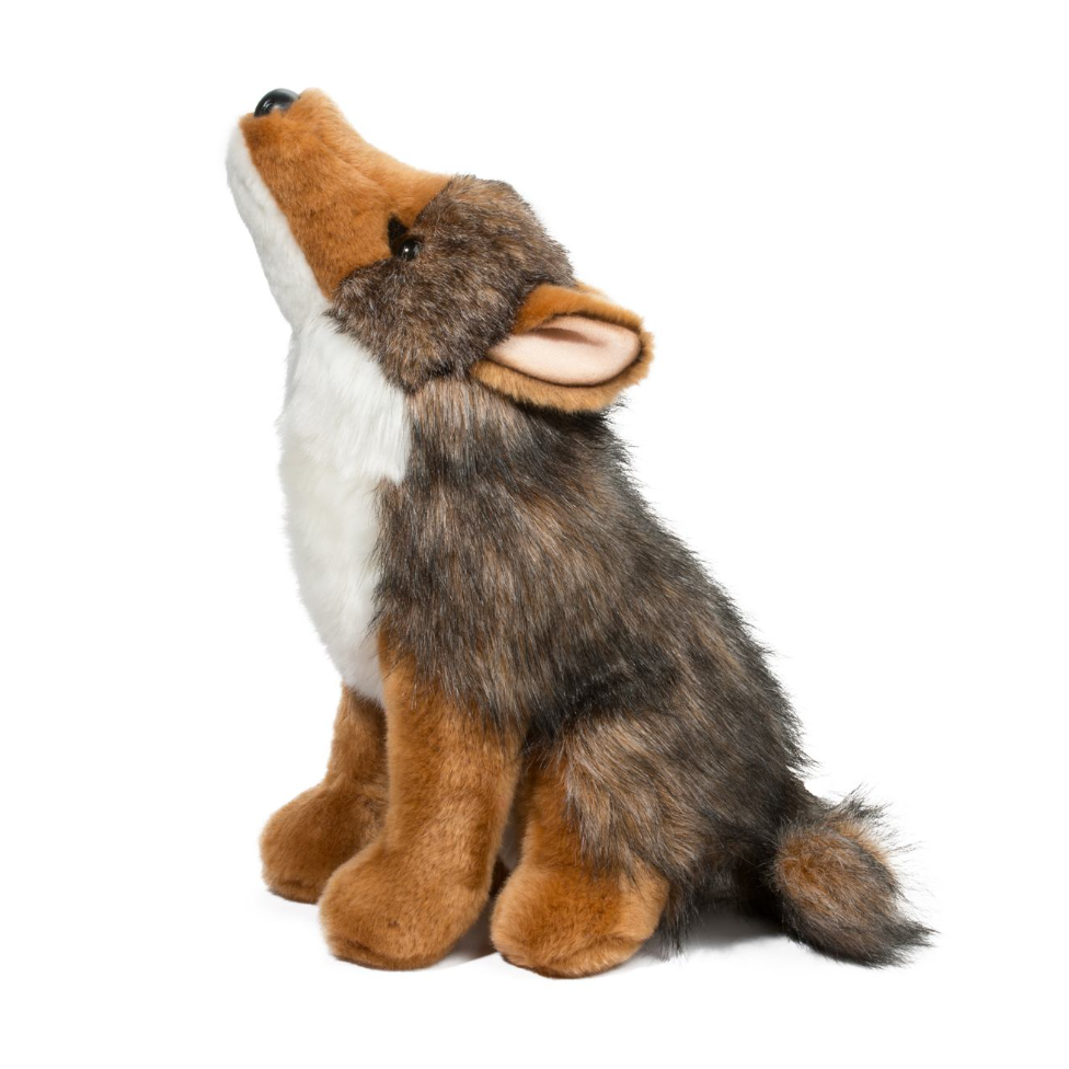 Seated comfortably on his haunches, Rambler the adventurous Coyote stuffed animal tips back his head and lets out a long high pitched howl to the night sky. Surrounded by lonely prairie grasses he wonders if anyone will answer his call. Maybe someone will hear him tonight and come out to join him in his frolics! Rambler’s plush coat features a realistic blend of grays and browns with a handsome chestnut colored snout and paws. Bright white fur runs down his chin and neck to his soft, fluffy belly. A black, sculpted nose and luminous, amber colored eyes complete his look. An accurate depiction of his real life counter parts, Rambler the plush Coyote is an ideal teaching tool, perfect for the home or classroom!