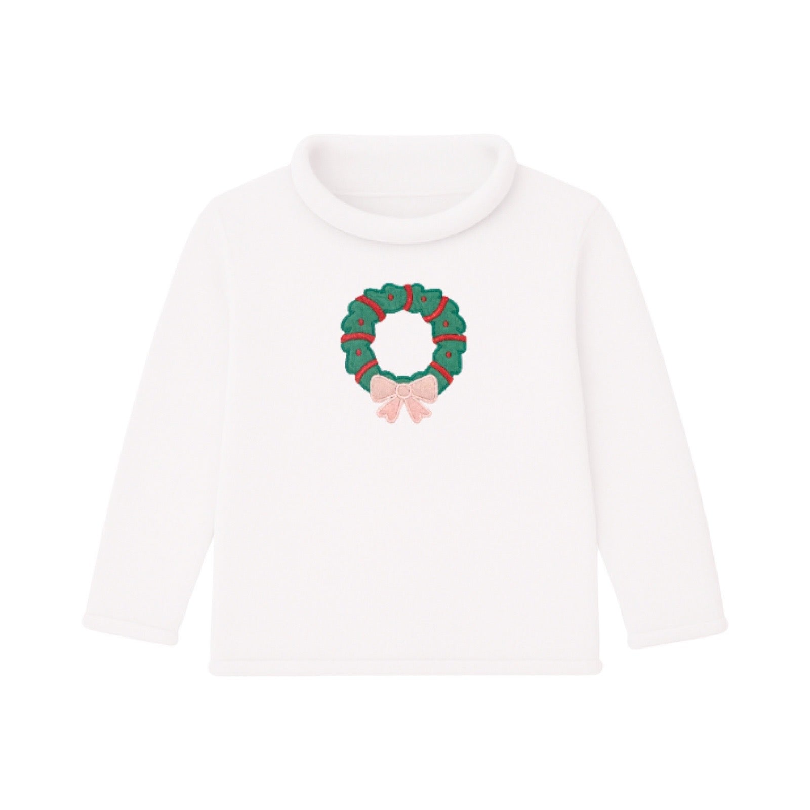 Darling fine gauge rollneck sweater adorned with a festive Christmas wreath applique and charming pink bow. Perfect for holiday celebrations, this cozy knit pairs beautifully with pink leggings or corduroys for an effortlessly chic seasonal look. A delightful choice for little ones who love festive style!