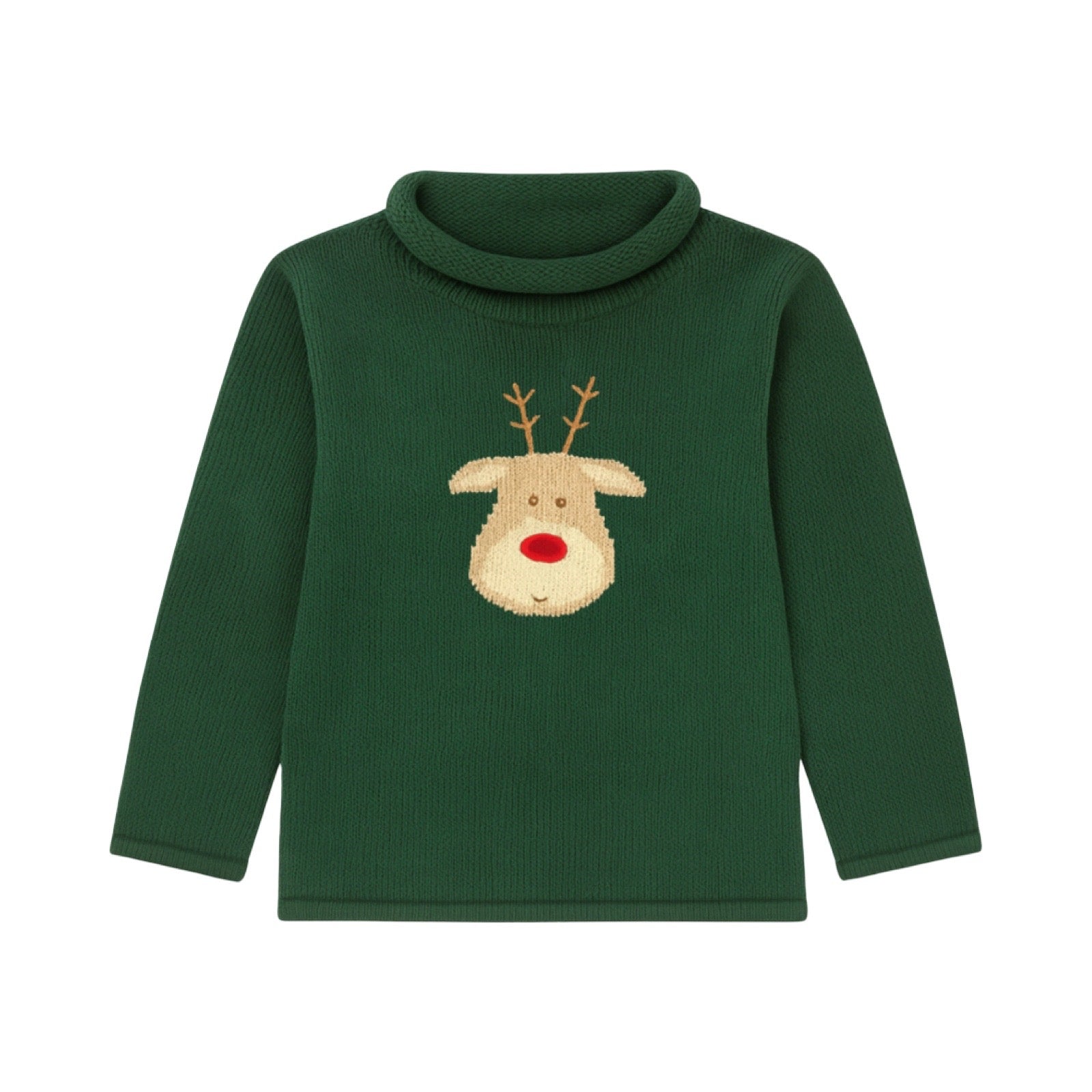 Bring holiday cheer to their outfit with this hunter green rollneck sweater featuring a hand-knitted image of Dasher, one of Santa’s favorite reindeer. Cozy and playful, it’s the perfect way to celebrate the season in style and warmth.