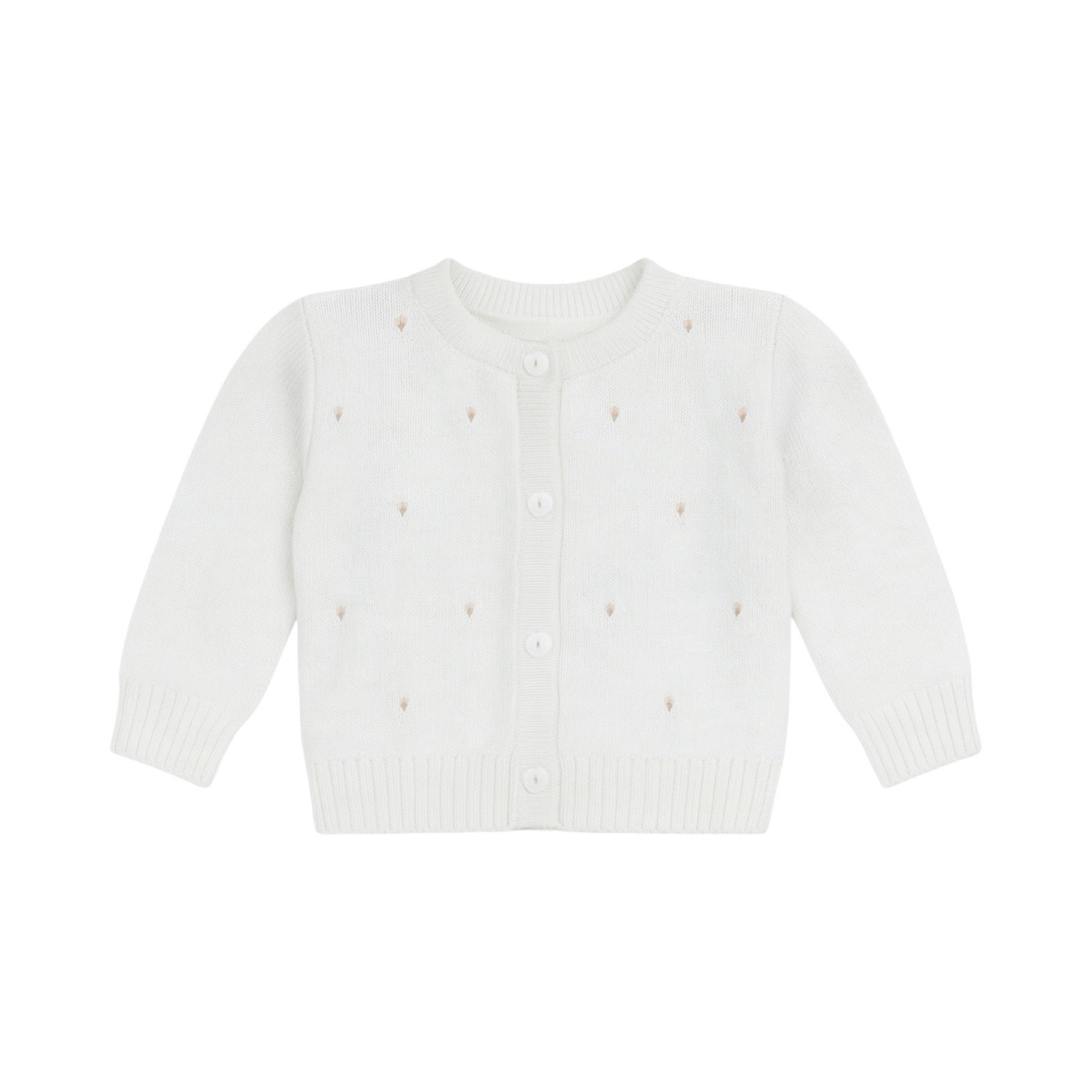 Wrap her in the soft and gentle touch of this darling little white cotton cardigan with tiny little rosebuds all over. Featuring sweet and simple tiny rosebud stitching, this white crew neck sweater will become a cozy staple in your little girls wardrobe.