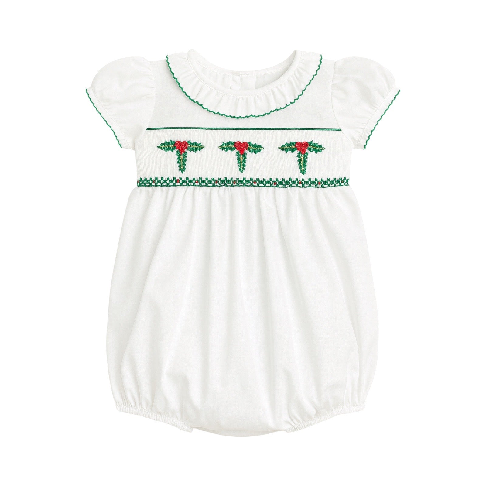 This charming short sleeve white bubble features festive Christmas green picot trim and delicate holly smocking on the front. A sweet bow at the back adds an extra touch of holiday cheer, making it perfect for your little one’s seasonal celebrations.