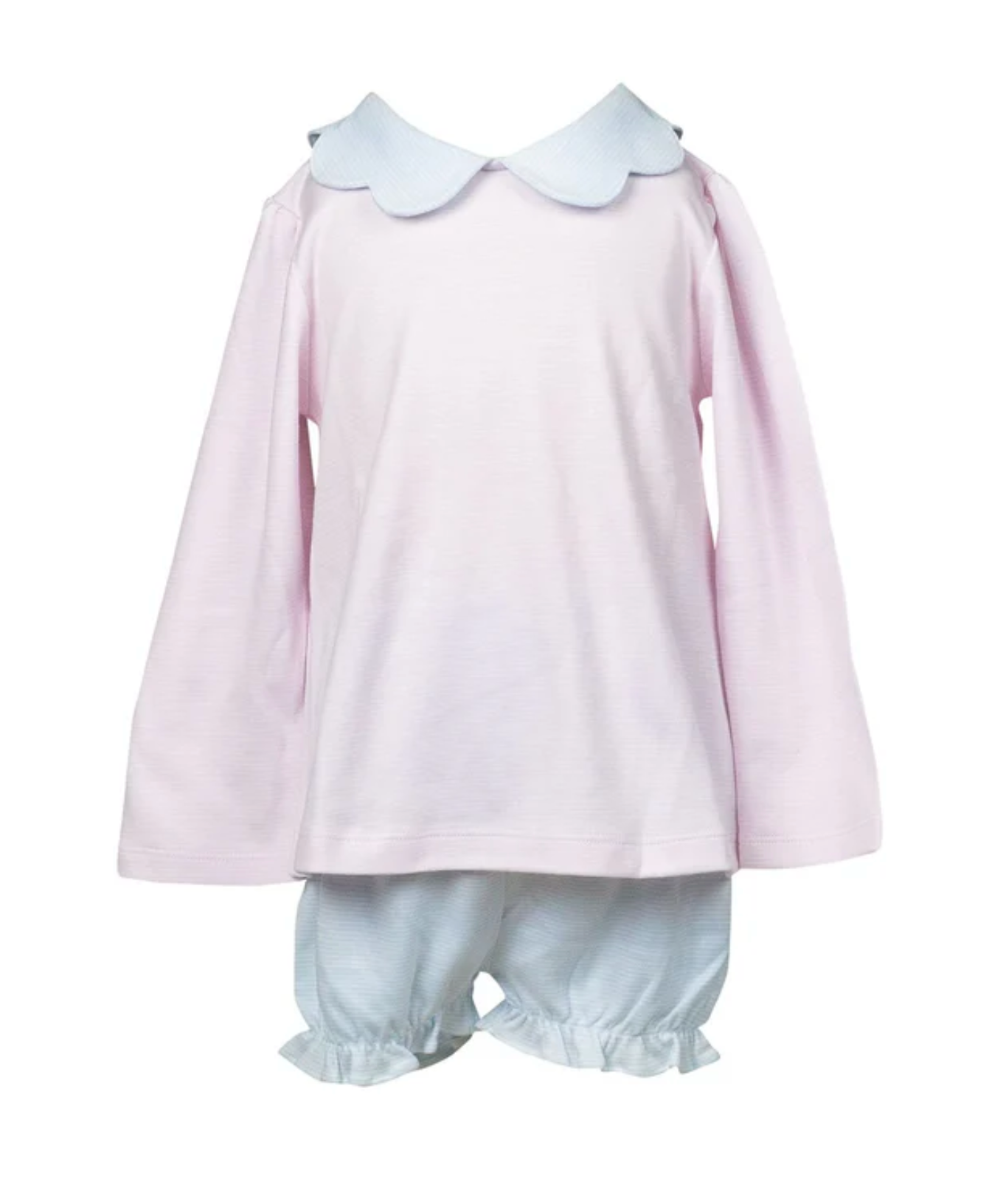 Our Proper Basics Scallop Bloomer Set in Pink Stripe is a playful addition to your little one’s wardrobe. Soft, comfy, and perfectly striped, these bloomers mix and match effortlessly with your favorite tops and accessories. Ideal for everyday adventures or special moments, they bring a touch of charm and comfort to every outfit.