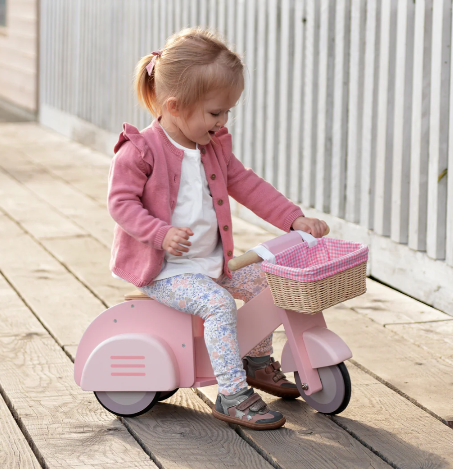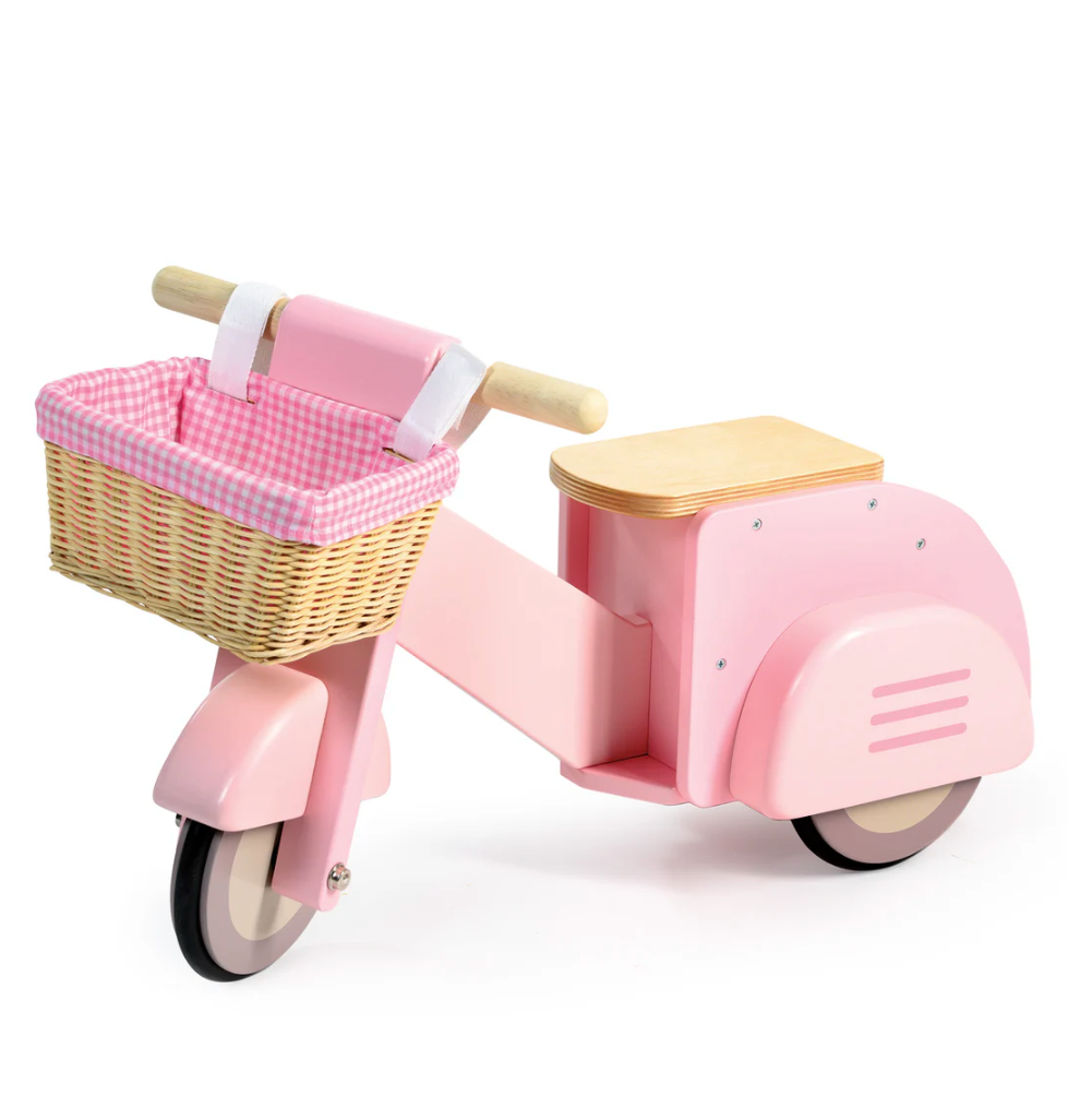A very pretty ride on scooter in the best pink colour! A wicker basket lined with pink gingham to carry the groceries or teddy. The basket is attached with removable white tapes. Included is a set of pretty stickers! Good for pretend play. Good for social and language skills.