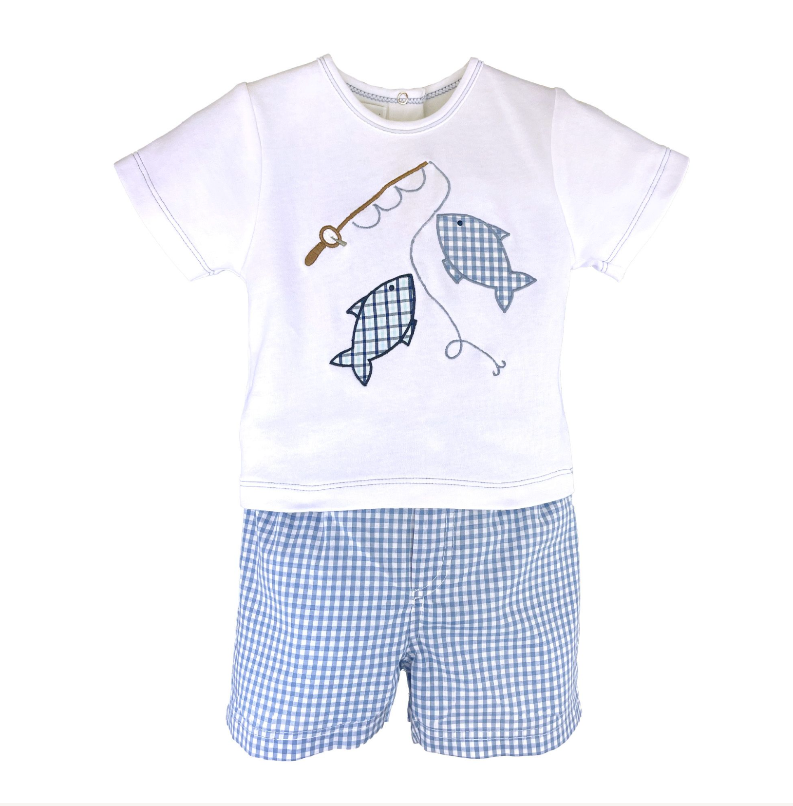 Keep your little one looking reel-ly stylish in our boys' short set with a charming fishing applique. The coordinating gingham shorts add a touch of classic charm to this playful outfit. Perfect for a day of fishing (or just looking cute)!