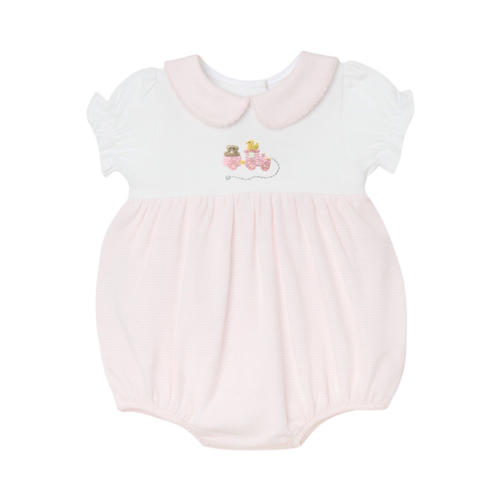 This charming bubble romper features sweet pink and white stripes, accented with delicate hand-embroidered pull toys for a whimsical touch. The classic Peter Pan collar adds an extra layer of cuteness, making it perfect for playful days and special moments alike. Soft and comfortable, it’s designed to keep your little one cozy while looking absolutely adorable.