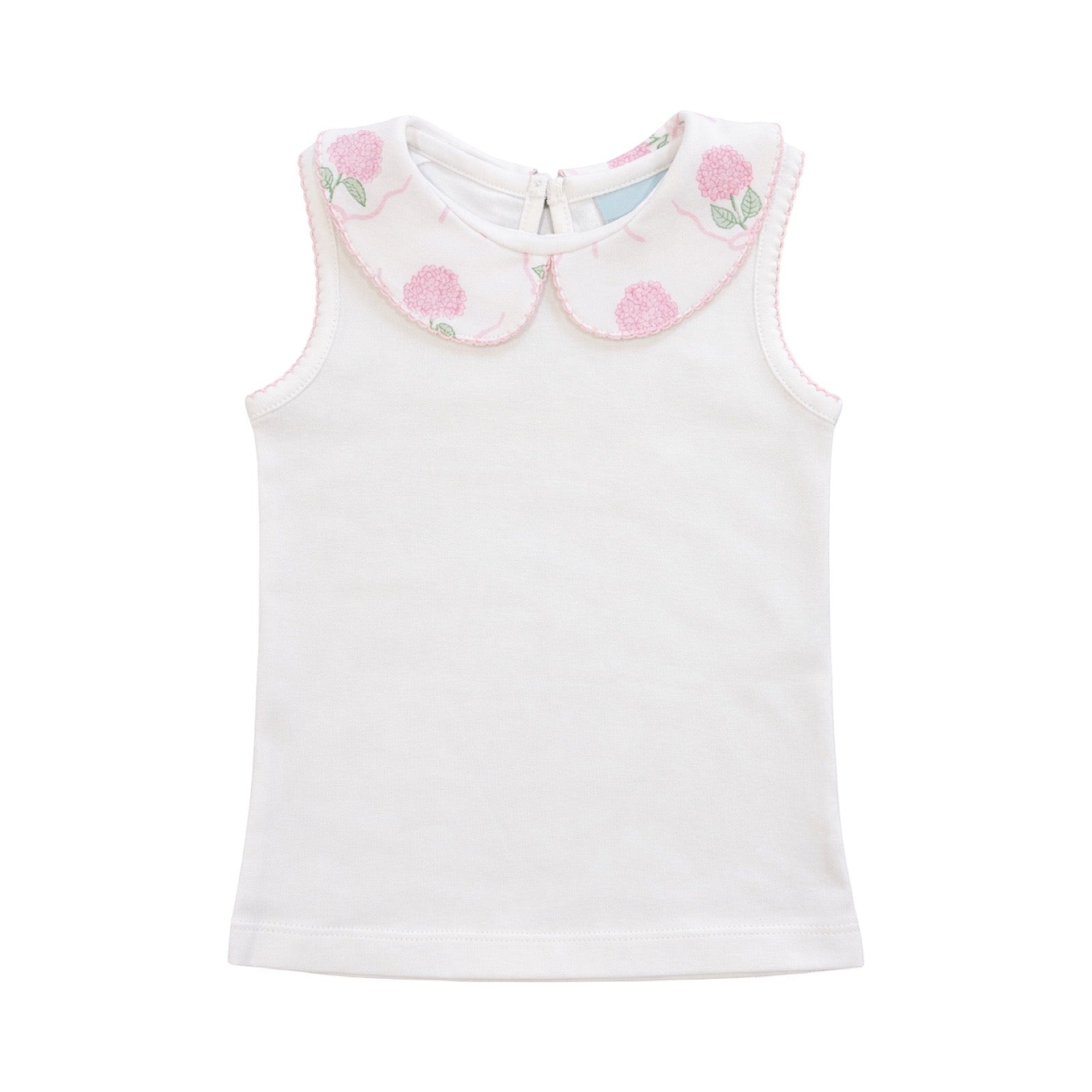 Effortless elegance meets playful style in this sleeveless collared top, perfect for warm-weather adventures. The crisp collar features a charming pink hydrangeas print that adds a pop of botanical beauty to any outfit. Lightweight and breathable, it's ideal for layering or wearing solo. A timeless piece that transitions seamlessly from playdates to special occasions, this top brings personality and polish to your child's wardrobe.